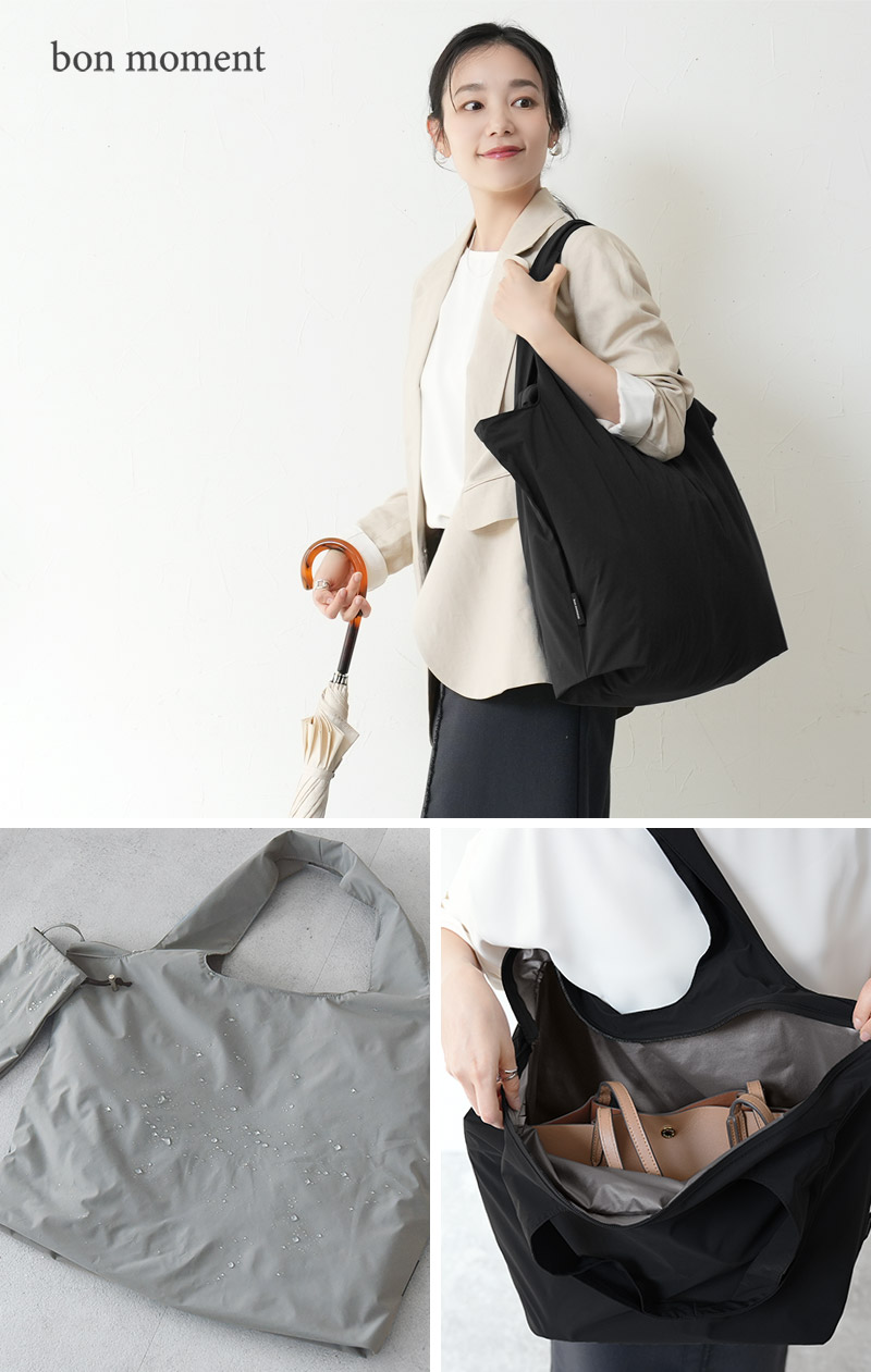 通勤バッグがまるごとすっぽり収まるサイズ感で、雨や汚れを防ぐ撥水加工付き。コレに荷物を入れておけば、お気に入りのバッグはもちろん、大切な書類やノートPCなども濡らさずしっかりと守ってくれます。
