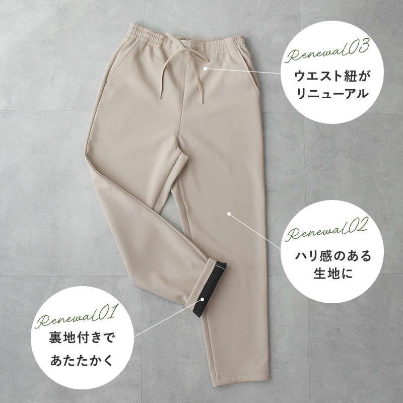 昨年登場して注目を集めた「リラパン」に新展開。冬をあたたかく乗り切れる裏ベロアタイプが登場しました。裏生地が変わっただけでなく、表生地もハリ感のあるキレイ見え素材にリニューアル。寒い冬に頼りになる一着です。