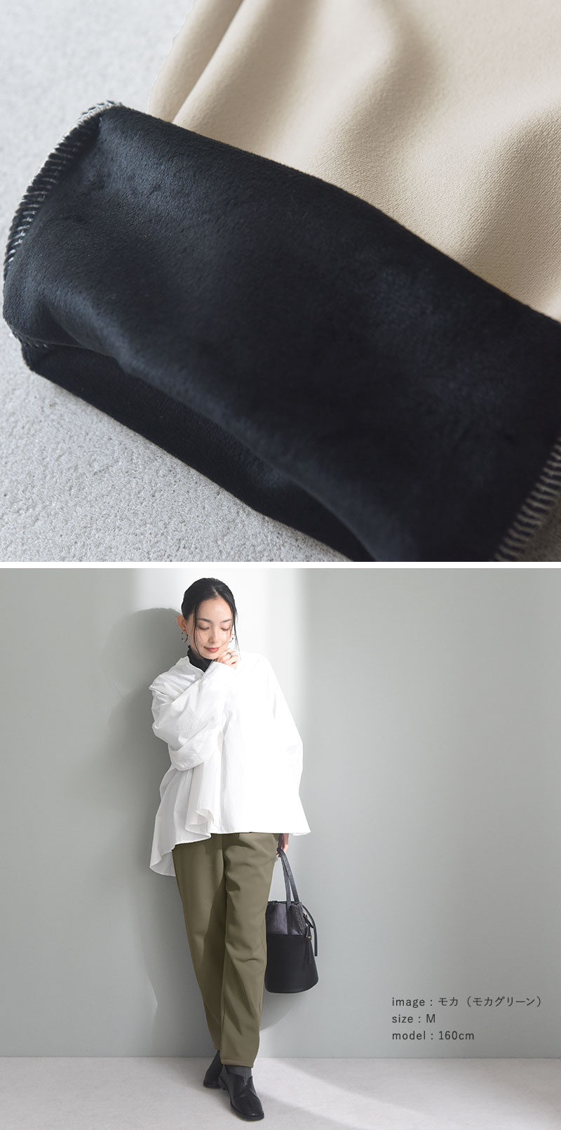 表地には、サラリとした質感でストレッチ性のあるジャージ素材を採用。ほどよくハリがある秋冬仕様の生地です。
