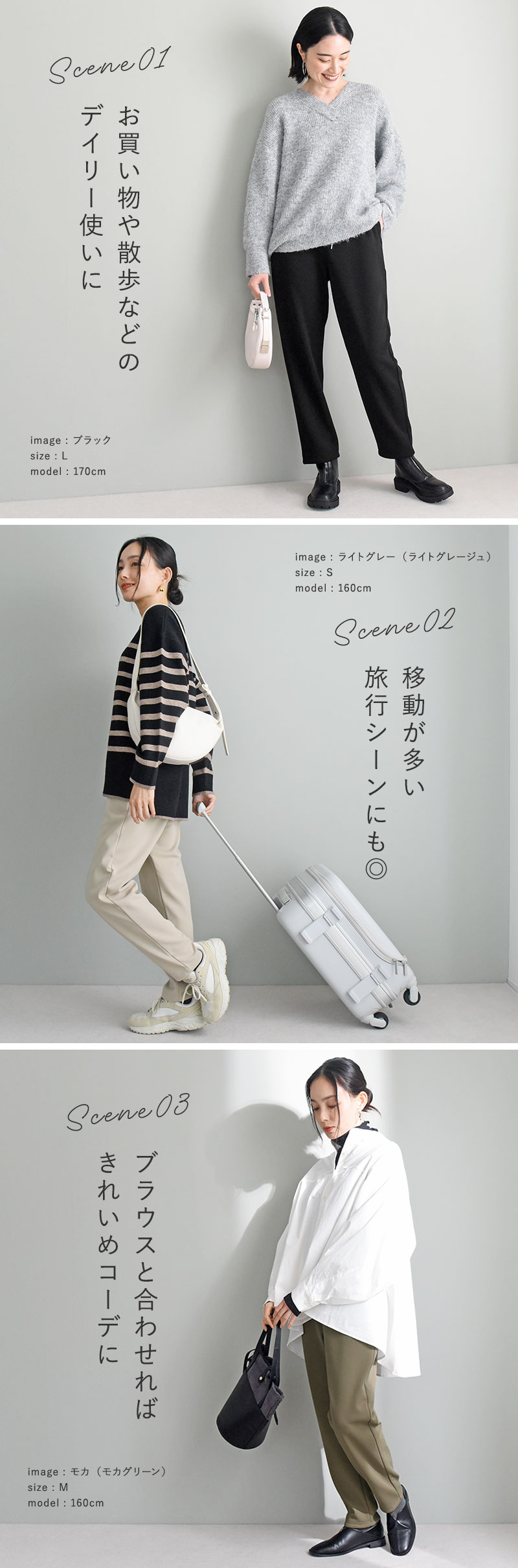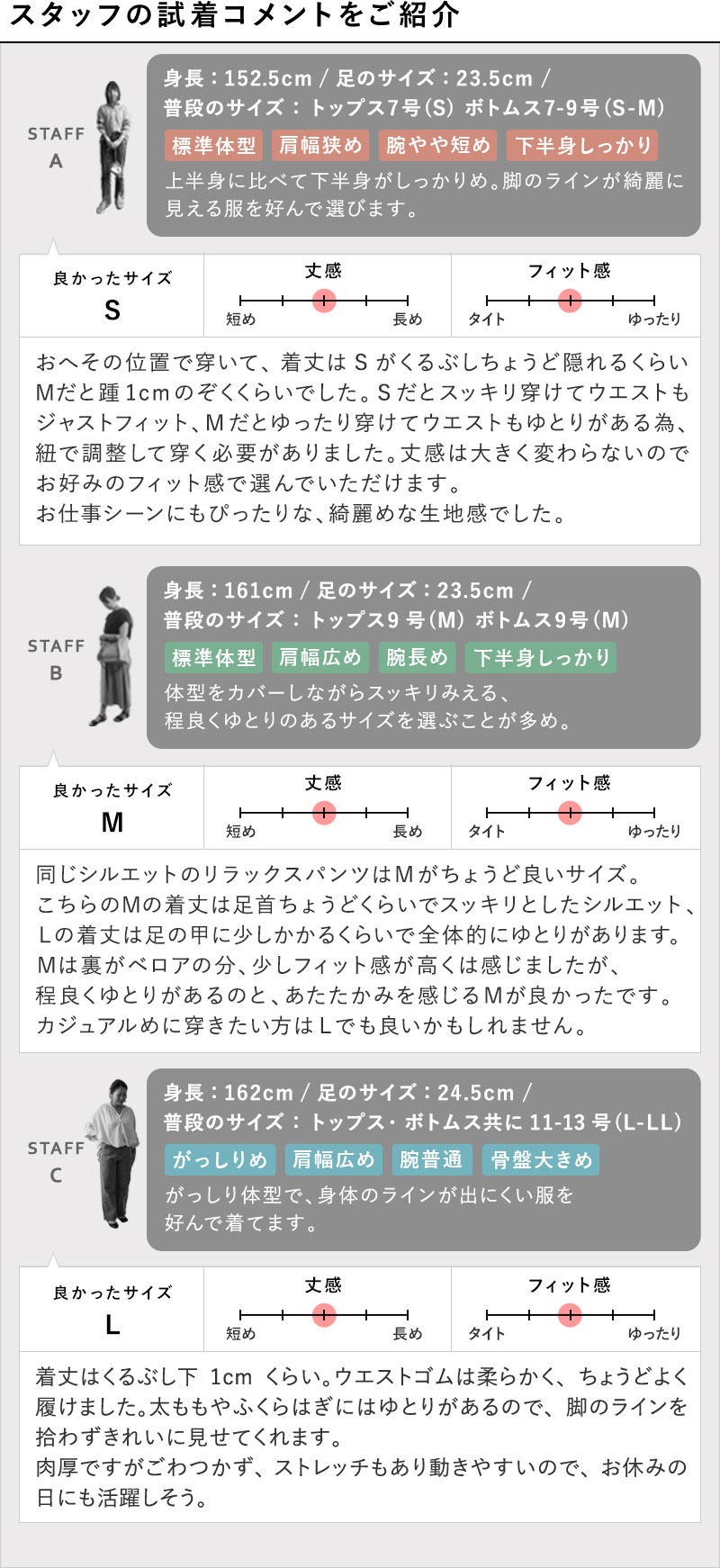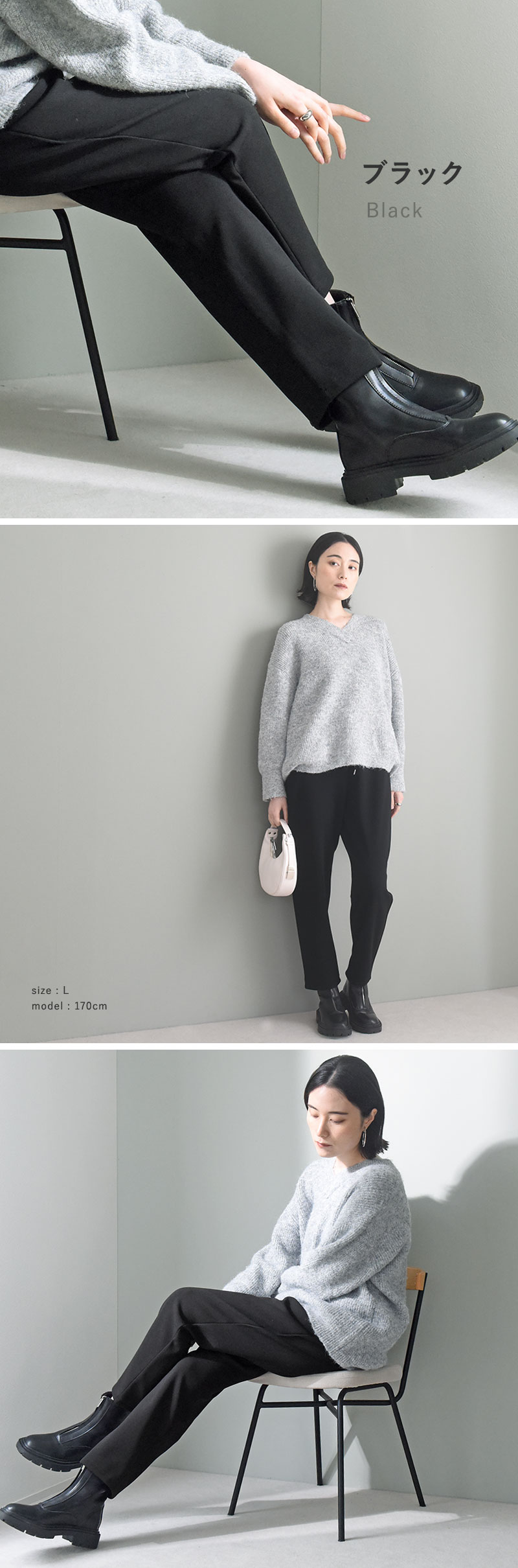 まるでルームウェアのような穿き心地ながら、着てみるとすらっと美しいシルエット。この絶妙なバランスが人気の秘密なんです。