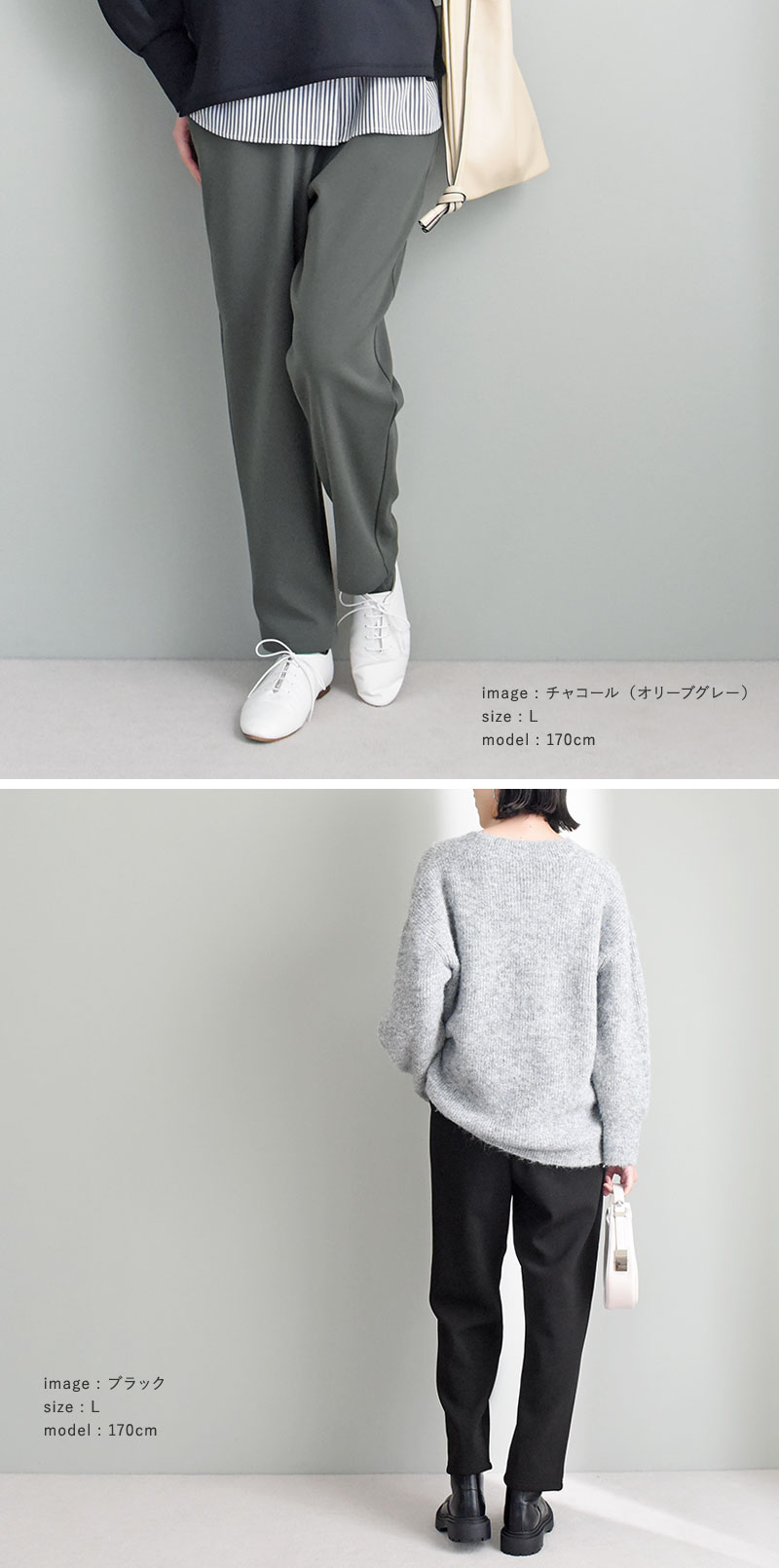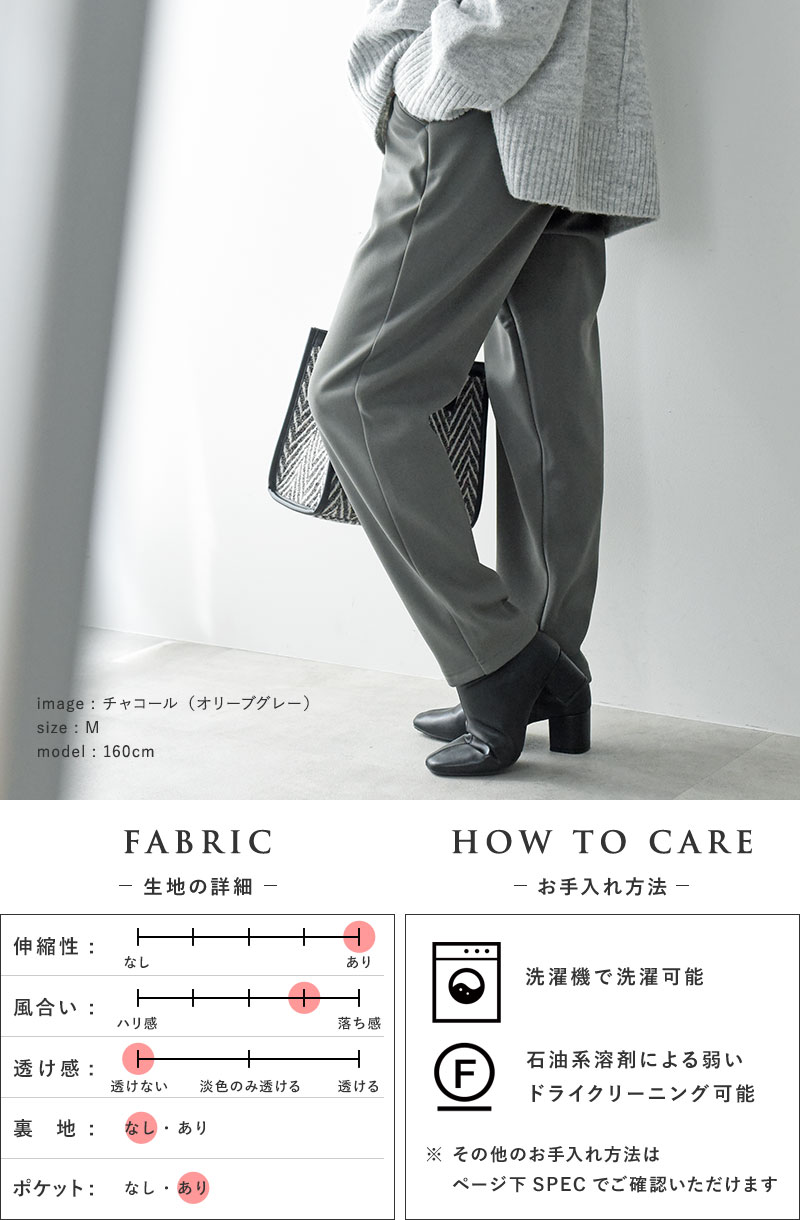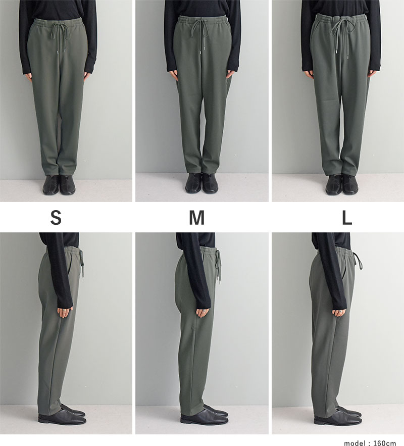 縦のラインをしっかり強調し、裾に向かって細くなるテーパードシルエット。腰回りゆったりで締め付け感もなくリラックス気分で着られます。縦ラインが強調されることで美脚効果も。