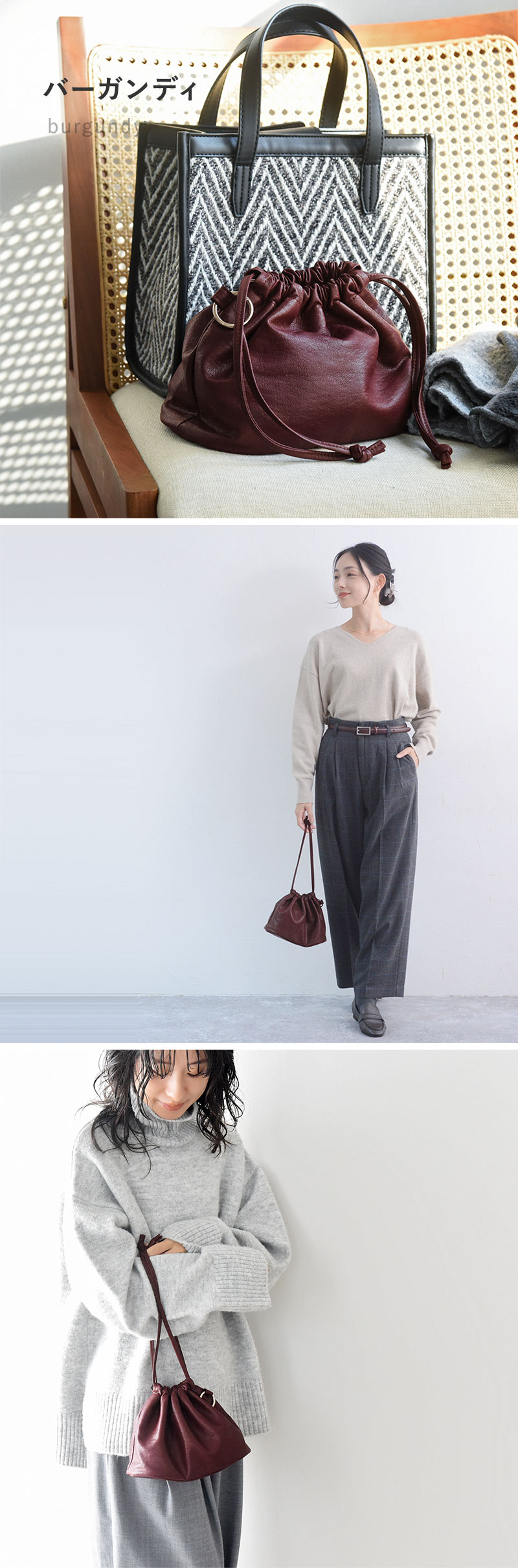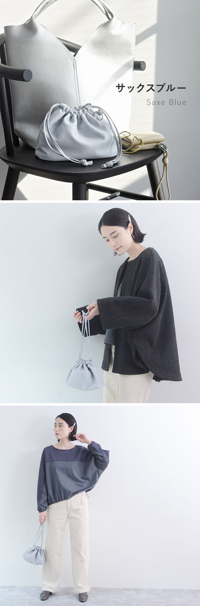 くたっと柔らかく手に馴染む、フェイクレザー素材の巾着ポーチ。バッグインバッグとして小物を整頓したり、トートバッグの目隠しにしたり。そのまま持って巾着バッグとしても使える上品な印象に仕上げました。