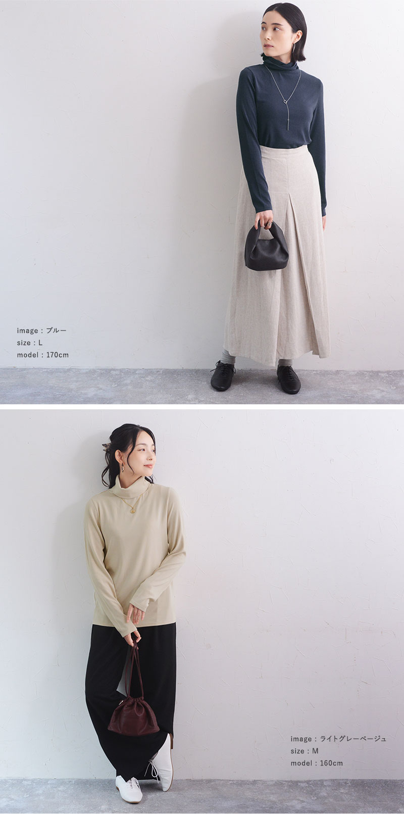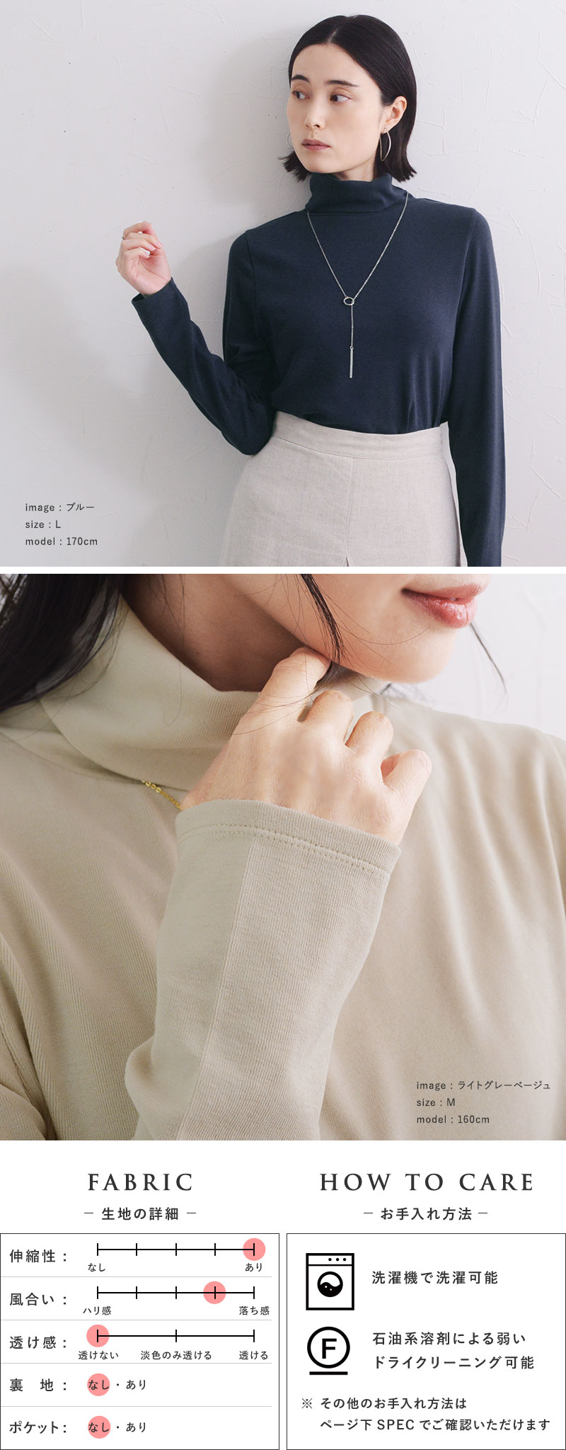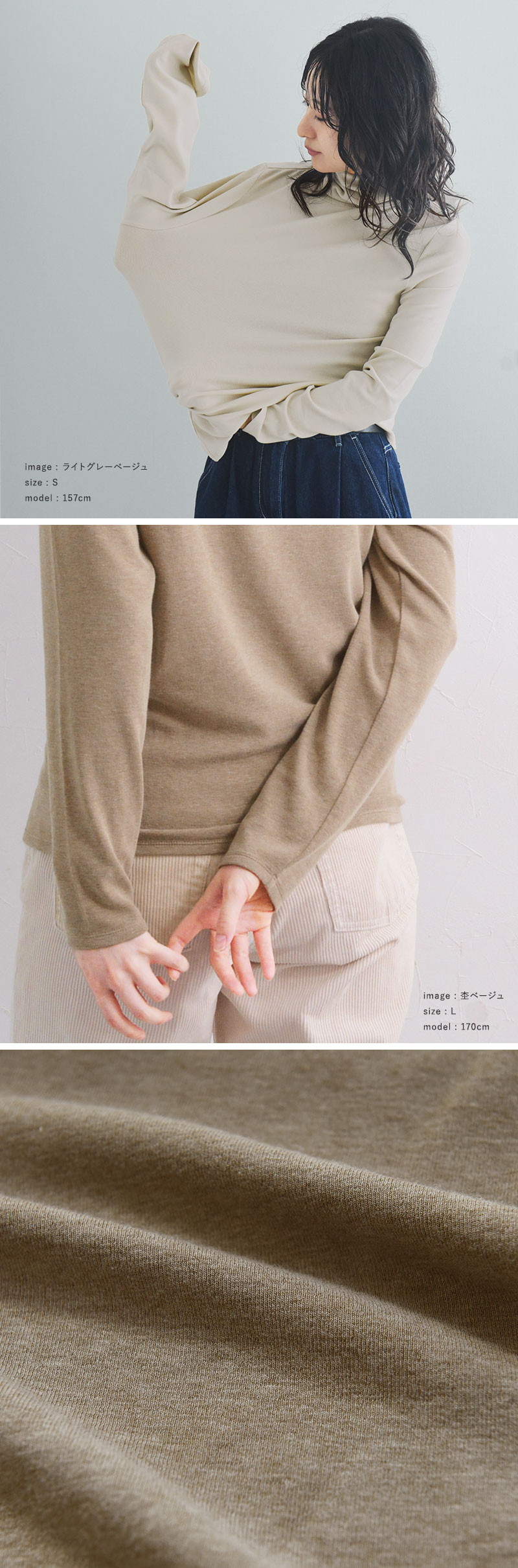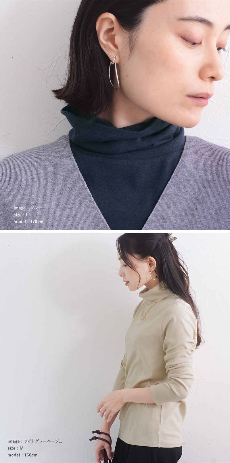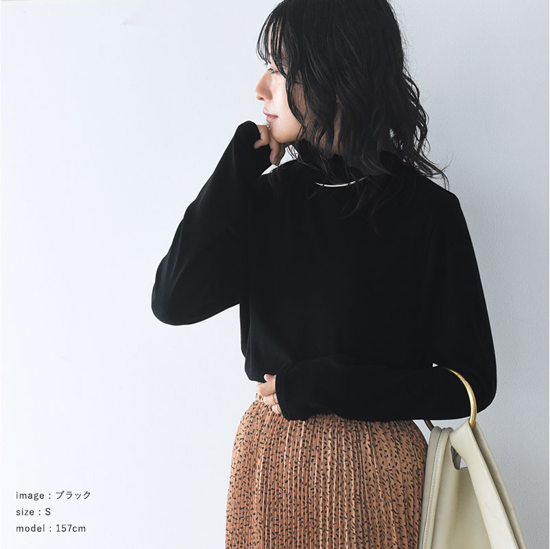 しっとりと柔らかな肌触りに思わずうっとり。チクチク感も一切なしで素肌がよろこぶ、ハイネックカットソーです。