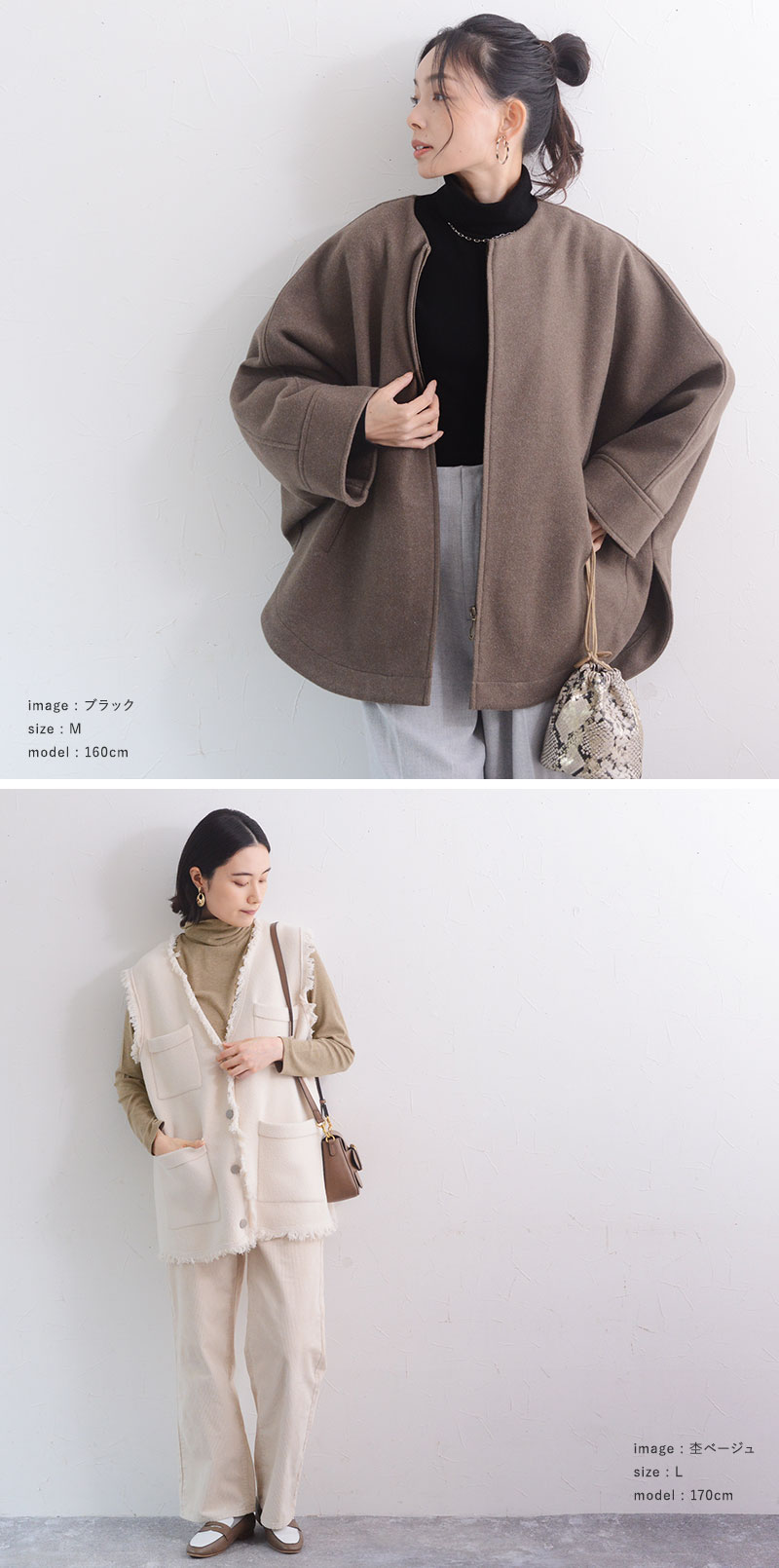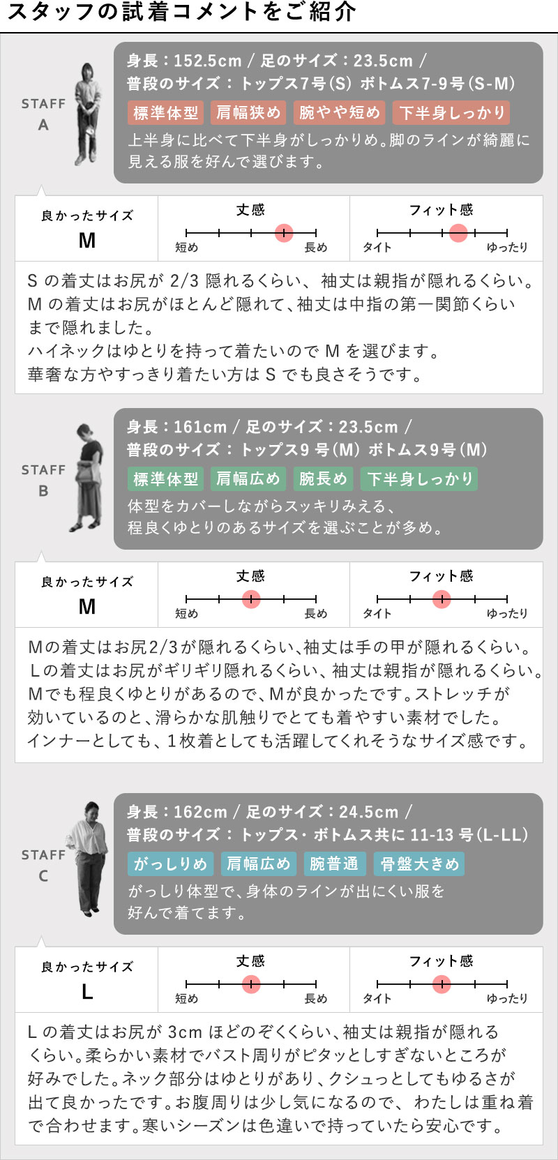 異なる身長のスタッフが着用してみました。サイズ感やコーディネートのご参考にどうぞ。