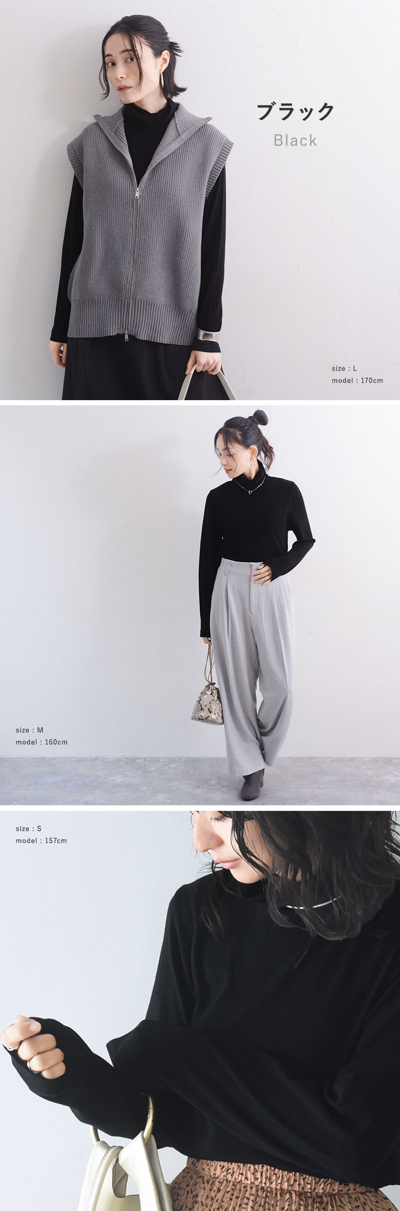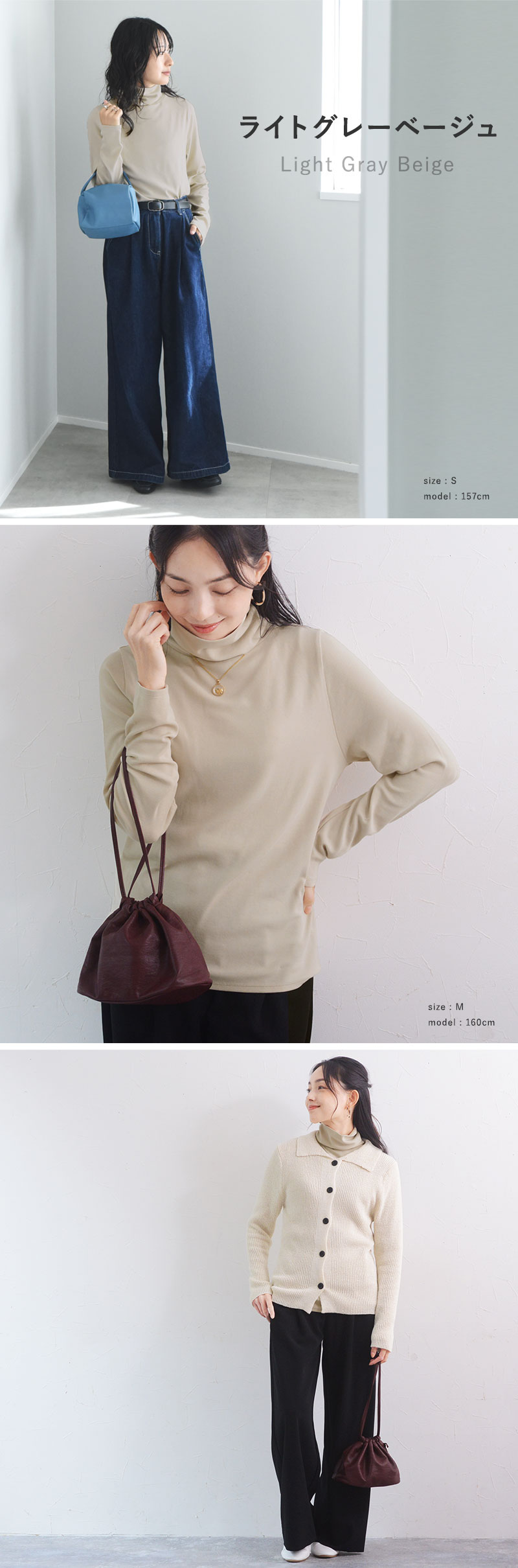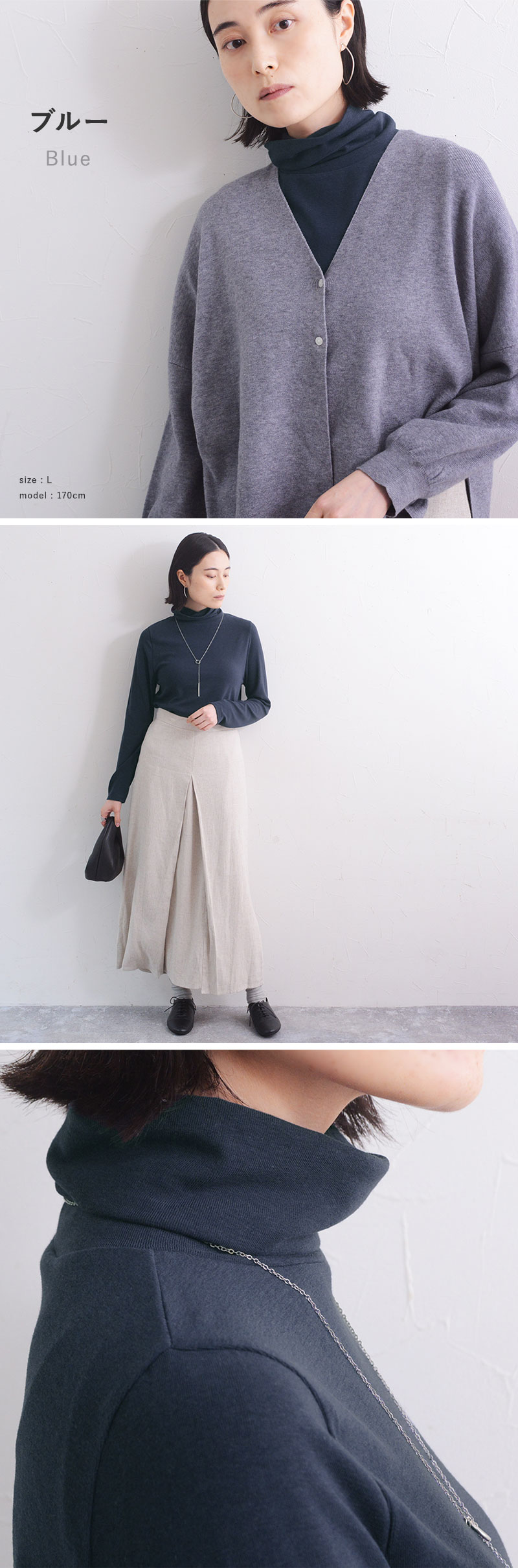 ほどよい厚さなので、インナーとしてはもちろんのこと、一枚でさらっと着こなすことも。晩秋から春先までロングシーズン活躍してくれます。