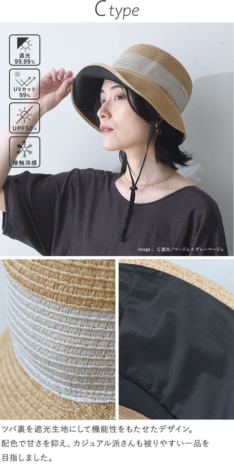 デザインはアシンメトリーシルエットで、リボンの太さが異なる2種類をご用意。さらに今年はツバ裏部分が遮光生地になった機能派タイプも登場しました。
