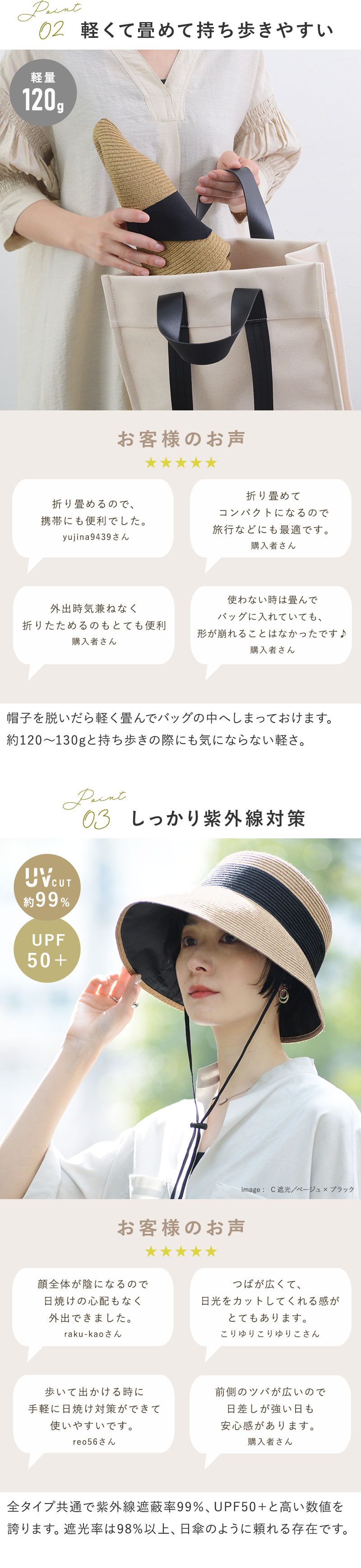 折り畳めて洗える、毎年人気のブレードハットに遮光タイプが登場しました。ツバ裏に遮光生地をあしらうことで、日差しを遮断できる機能性ハットです。