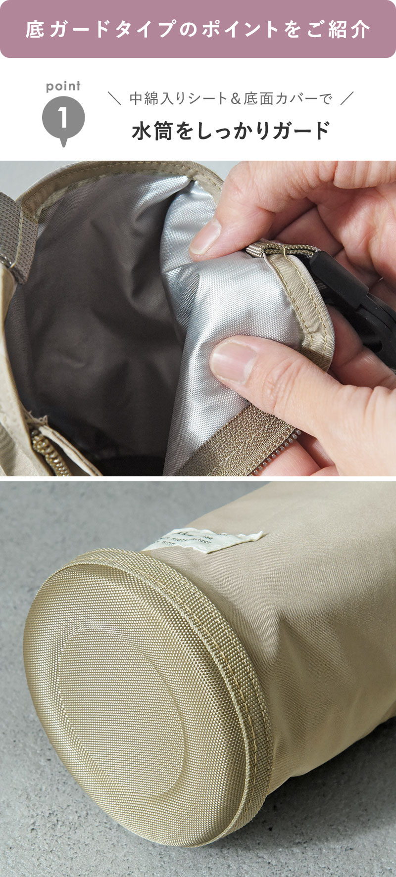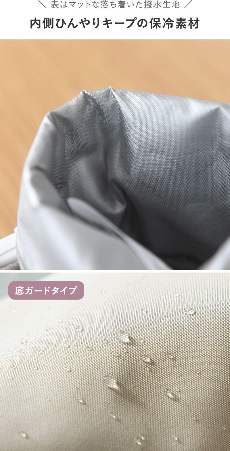底ガードタイプの表面には撥水加工が施されているので、うっかり水筒から水滴が落ちても安心です。汚れたらお家でお洗濯もOK。