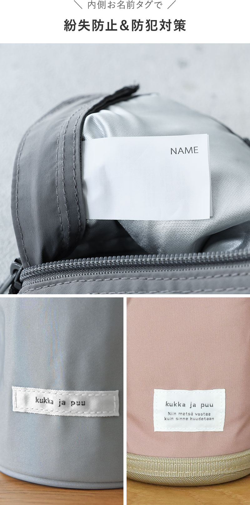 知らない人に名前を見られないように、お名前タグは内側に付けています。紛失対策だけでなく、 気になる防犯面も安心。