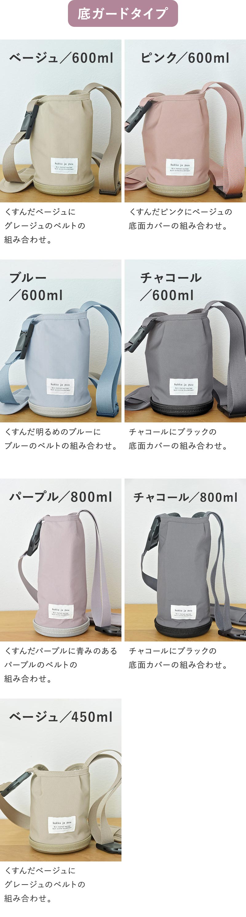 ご紹介するのは、kukka ja pu(クッカヤプー)のキッズボトル600mlと800ml、さらに450mlにぴったり合うサイズで作った専用カバー。見た目の相性も考えて、生地やパーツの色を組み合わせています。