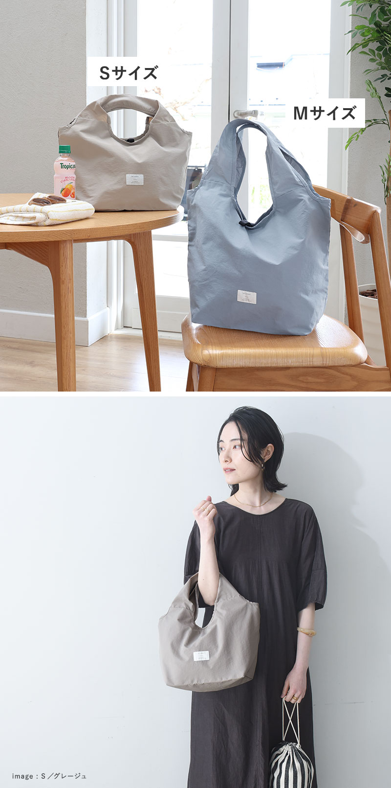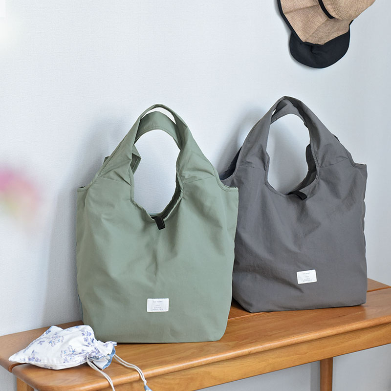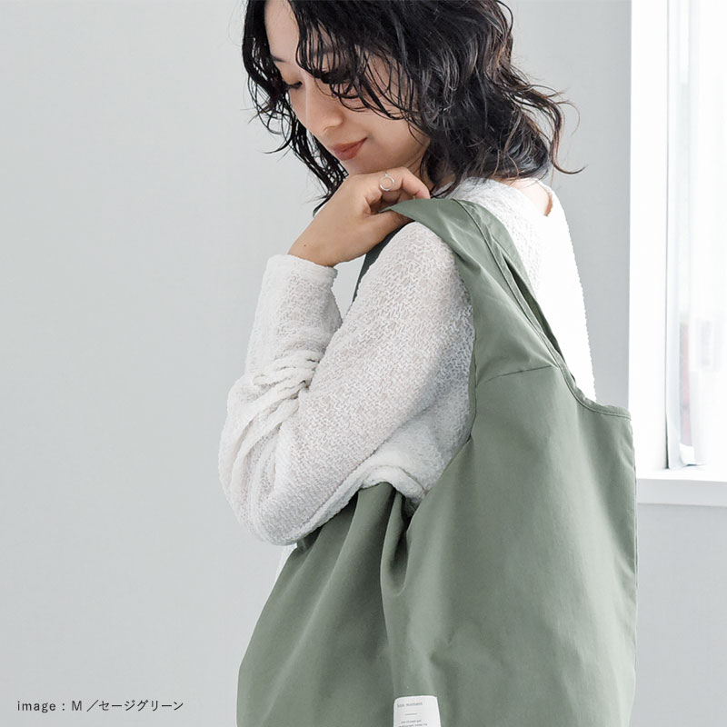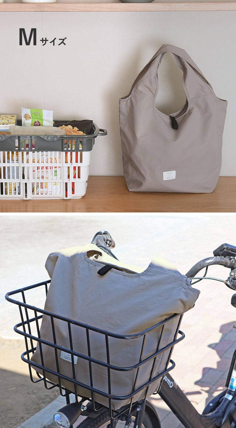 Mサイズは自転車のカゴにスッポリ入るサイズ感で、夕飯の買い出しにも◎。Sサイズはコンビニ弁当や、帰りがけにお肉や魚、アイスなどちょっと買い足したいシーンにぴったり。ありそうでなかった、理想のカタチのエコバッグです。