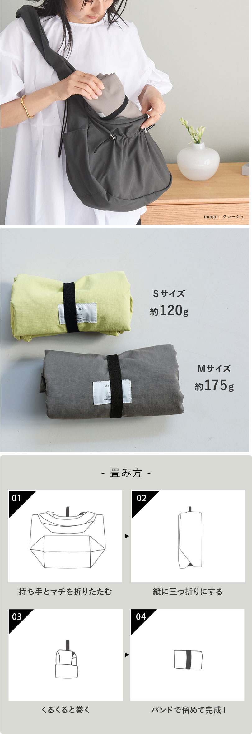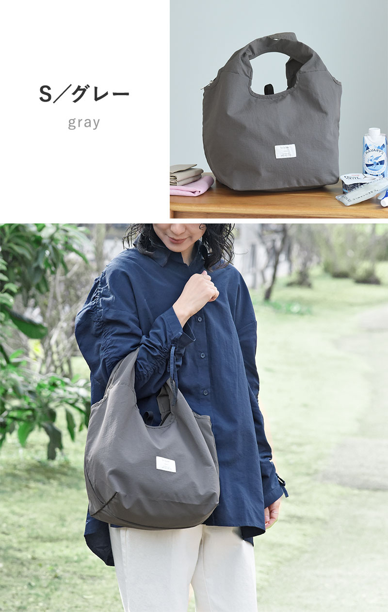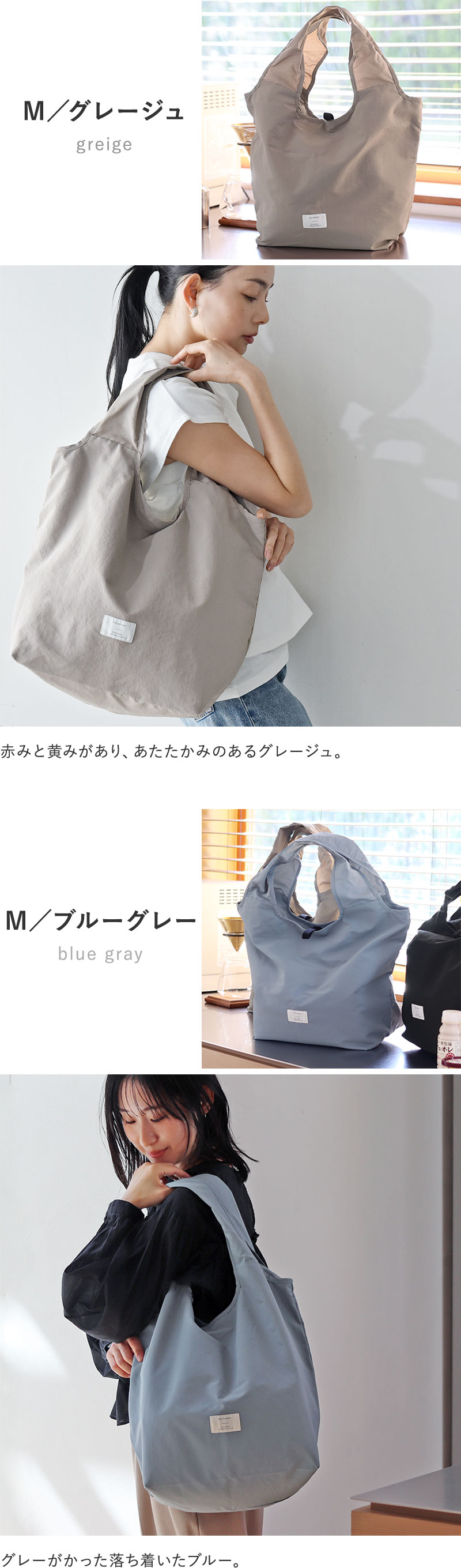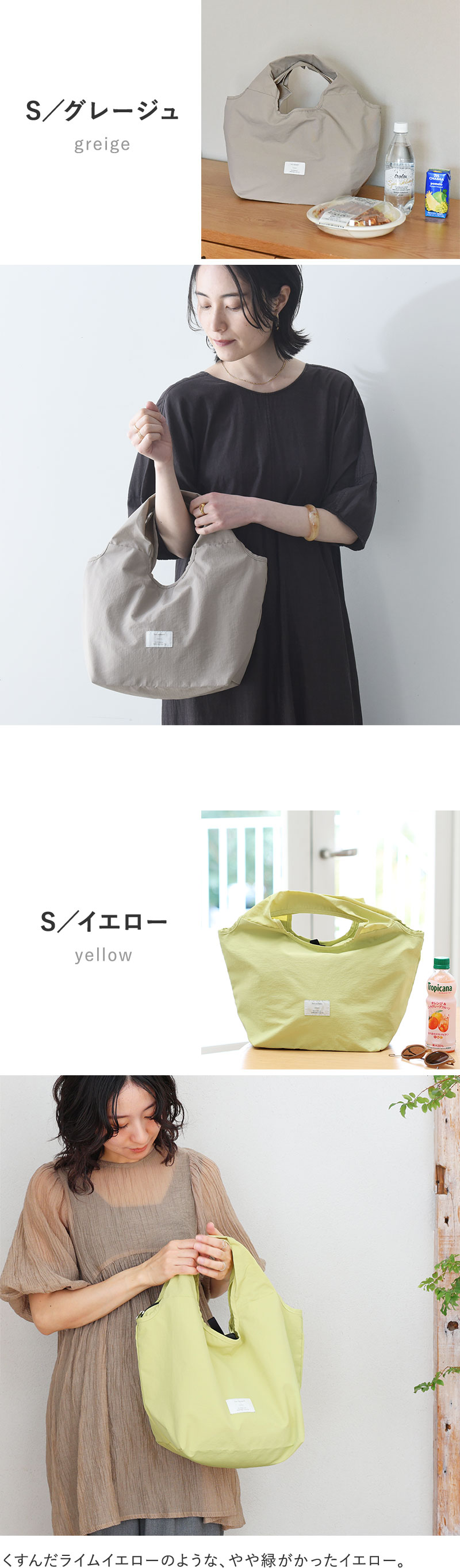 Mサイズは自転車のカゴにスッポリ入るサイズ感で、夕飯の買い出しにも◎。Sサイズはコンビニ弁当や、帰りがけにお肉や魚、アイスなどちょっと買い足したいシーンにぴったり。ありそうでなかった、理想のカタチのエコバッグです。