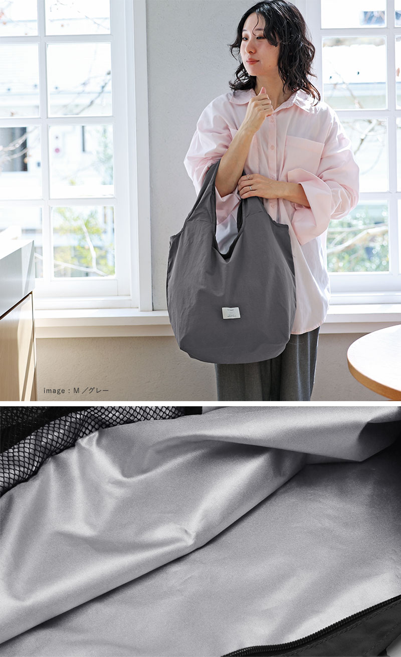 たくさん買い物をしても持ちやすい、太めの持ち手にしています。さらにMサイズの持ち手はゆとりを持って肩掛けできる長さに。コートなどで厚着していても腕を通しやすい設計です。