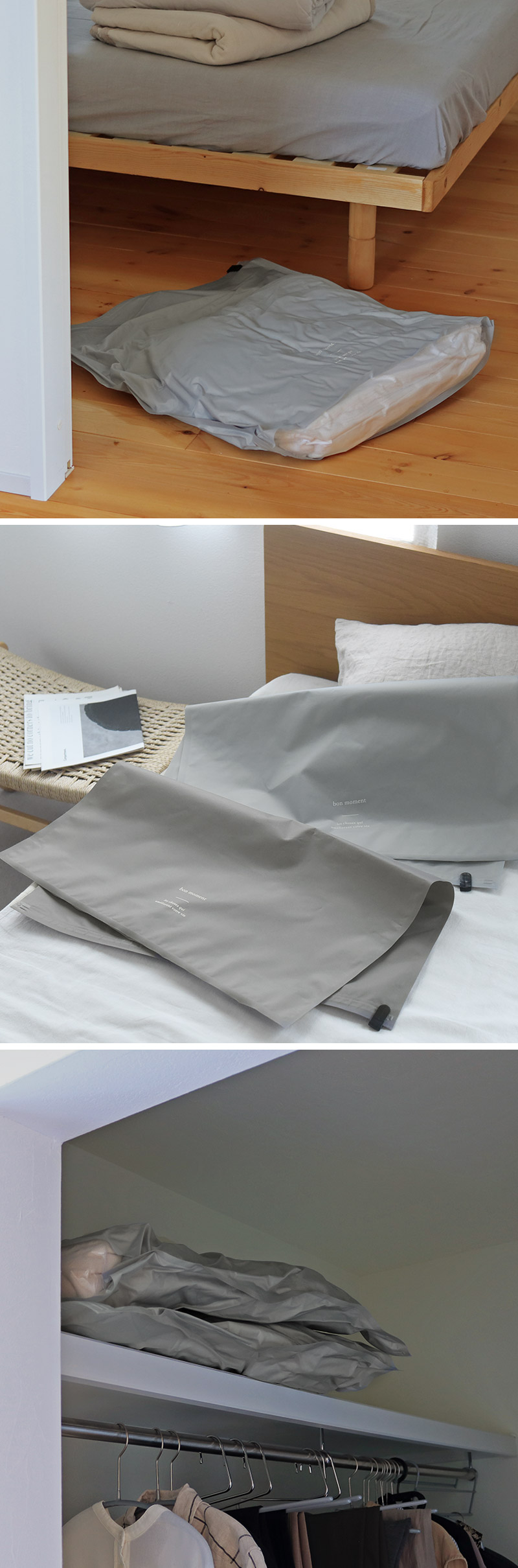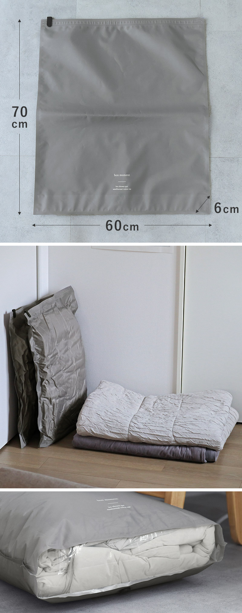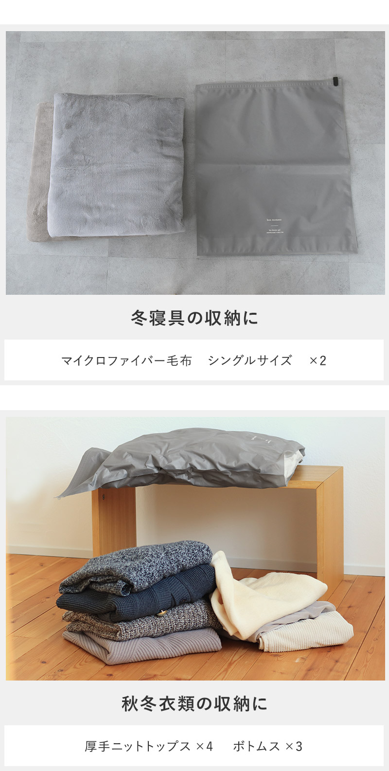 ※羽毛布団やダウンなどは機能性がそこなわれる可能性があるため使用をお控えください。衣類の場合、シワになりにくいものの収納を推奨しています。