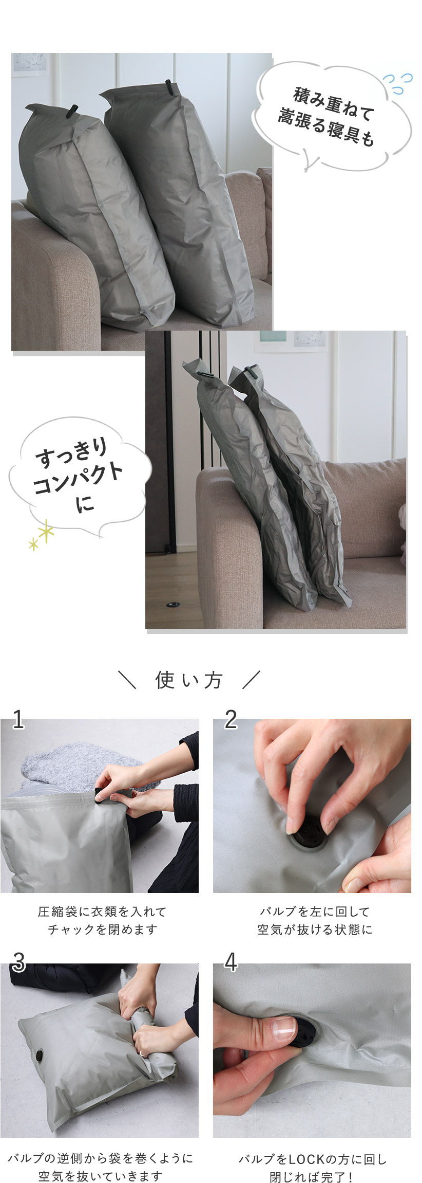 強い力を入れなくてもスムーズに空気が抜けて、ギュギュッと圧縮。抜群の圧縮力で空気がぬけてくる心配もなし。シーズンオフの寝具類もペタンコで収納しておけます。