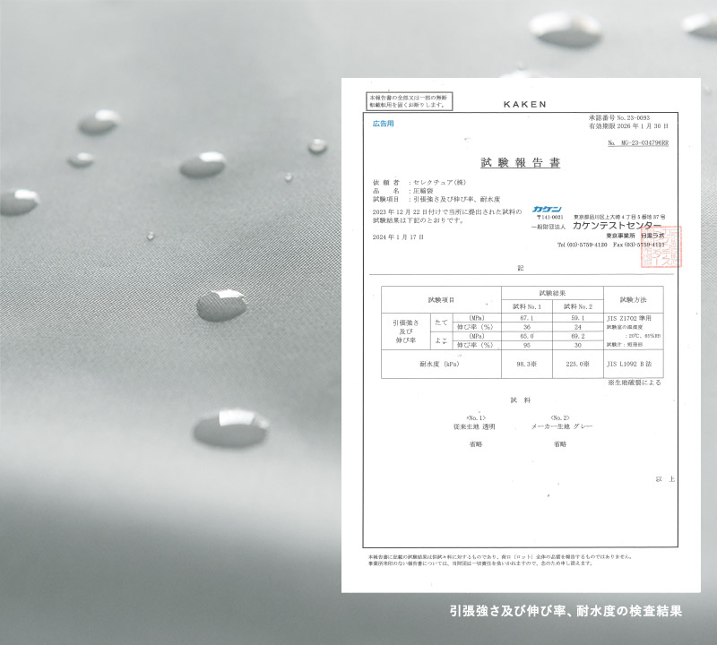 第三者機関による防水性の検査では、同一メーカー従来品を上回る結果に。通常の圧縮袋に使われる素材に比べ約2.3倍の耐水数値となりました。