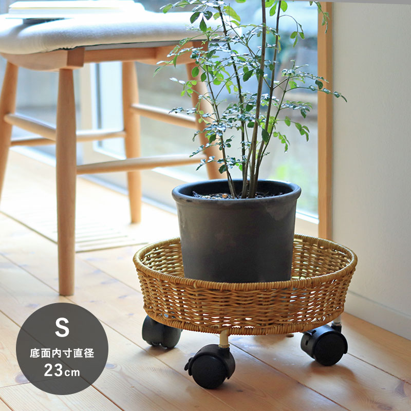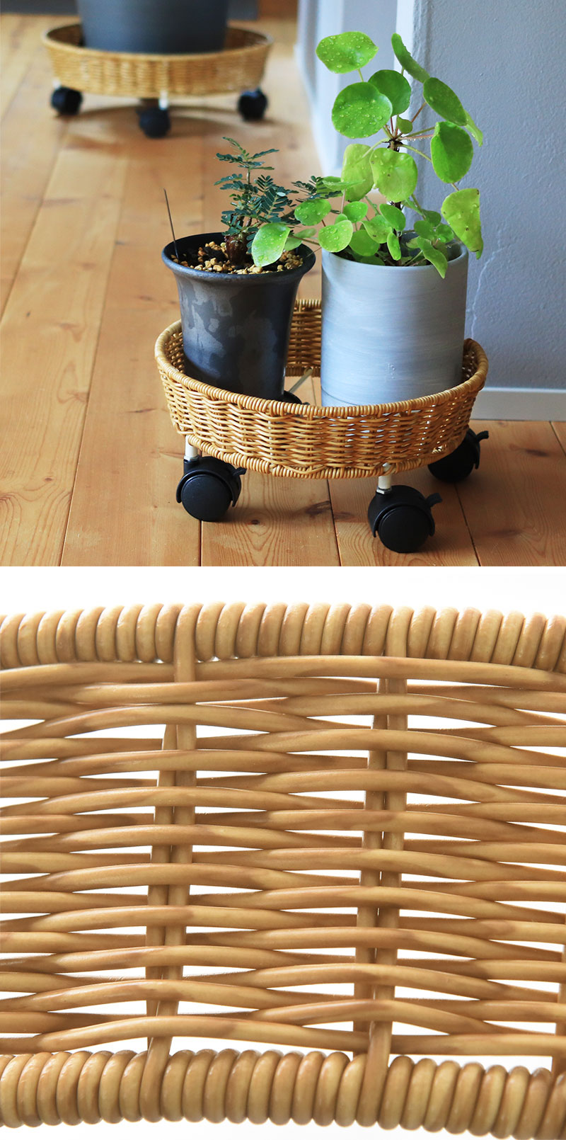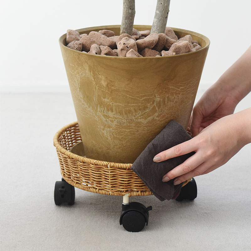 まるで天然素材のラタンを編んだような、ナチュラルな佇まいのプランターベース。植物との相性はもちろん、周りの家具やフローリングの木目とも馴染んでくれます。