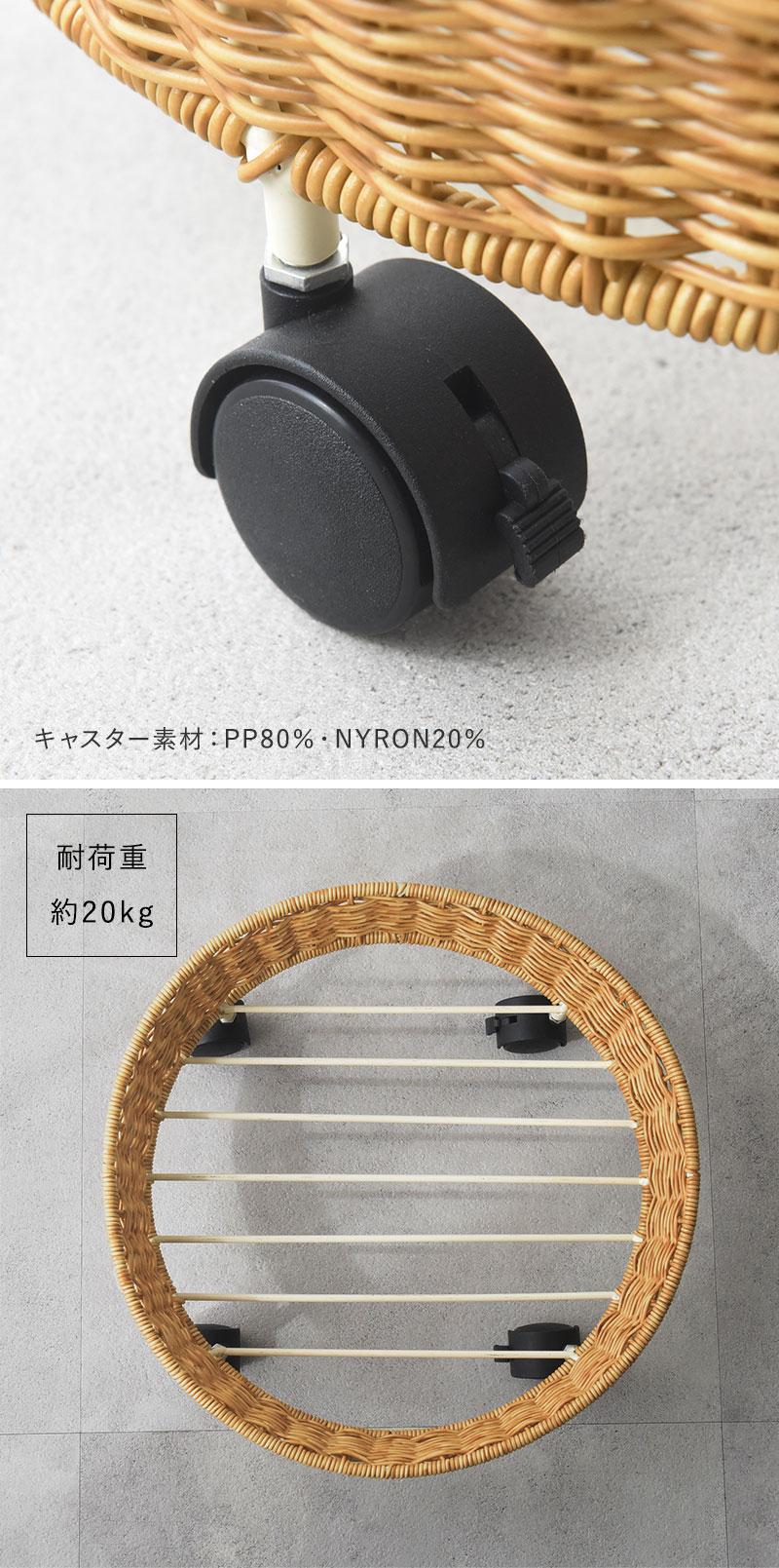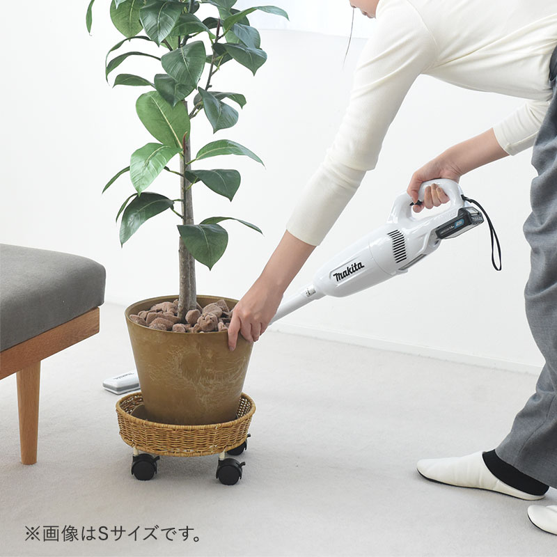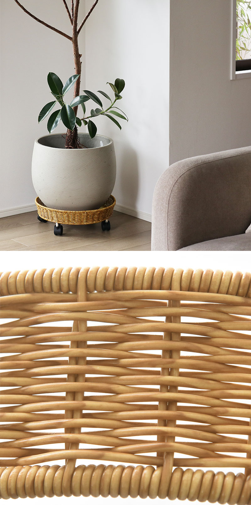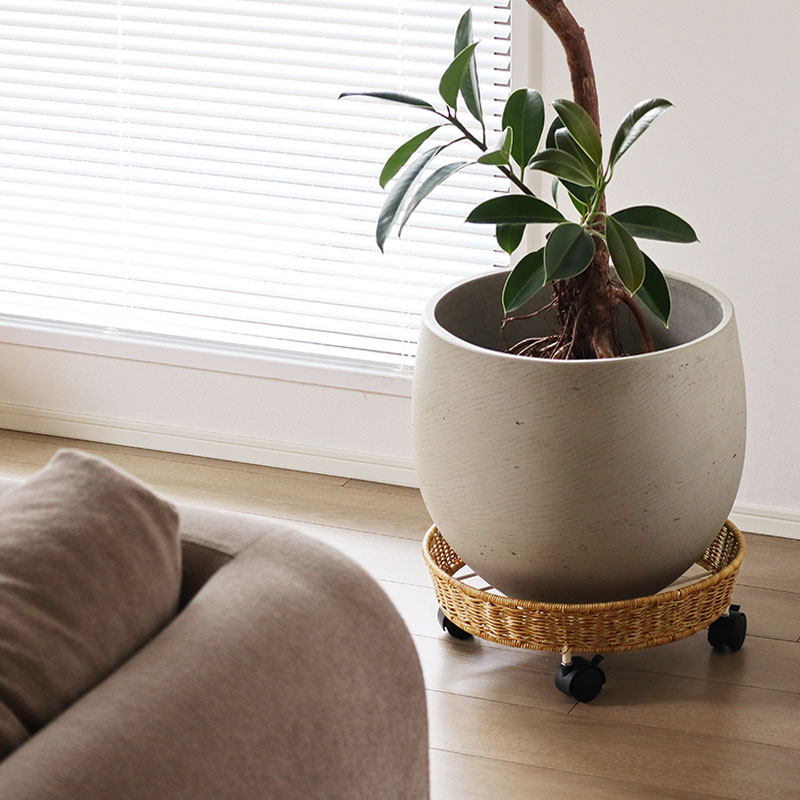 まるで天然素材のラタンを編んだような、ナチュラルな佇まいのプランターベース。植物との相性はもちろん、周りの家具やフローリングの木目とも馴染んでくれます。