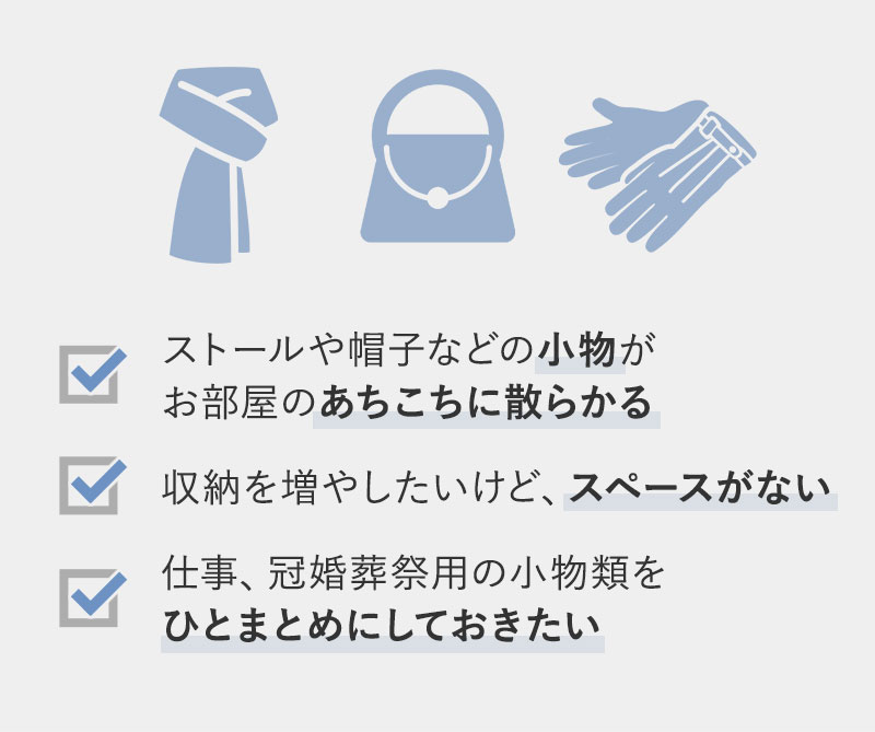 毎日のように使う小物の置き場所にするのも、ブラックフォーマル小物をしまっておく場所にするのも◎。お好きなものを入れてお使いいただけます。