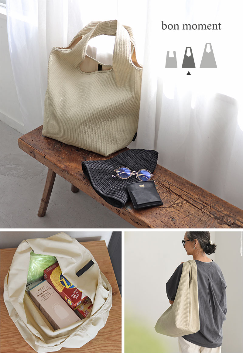 レジ袋有料化に伴い、スーパーやドラッグストア、その他のお店でも必要になってくるエコバッグ。bon moment(ボンモマン)のマチの大きなエコバッグMは、買い物カゴにゆったり入れた食材がちょうど入るくらいのサイズ感です。