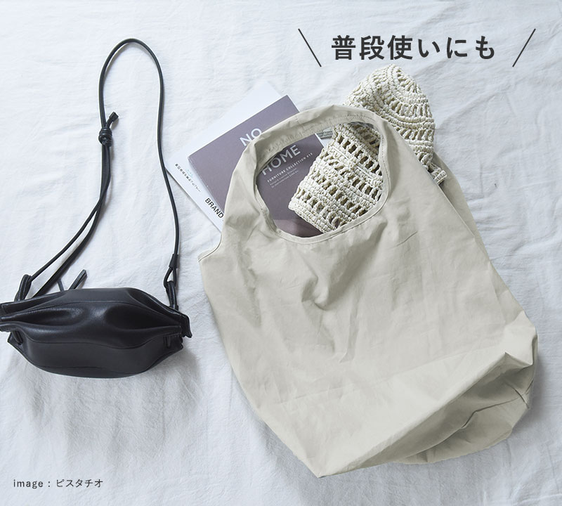 肩掛けしやすいカタチたくさん買い物をしても肩掛けしやすいように、腕を通す部分は広くて丸いカタチに。コートなどで厚着していても腕を通しやすい設計です。