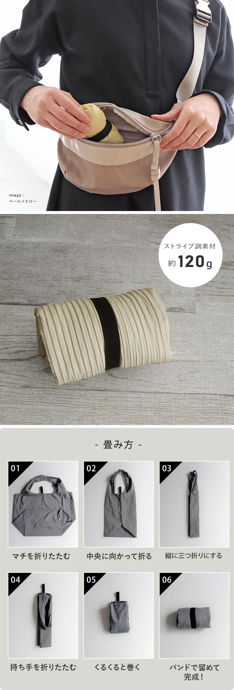 使わないときは、小さく畳んでまとめておけます。バッグの中に常備しておいても邪魔になりません。重さはわずか120g程と軽いのもポイント。
