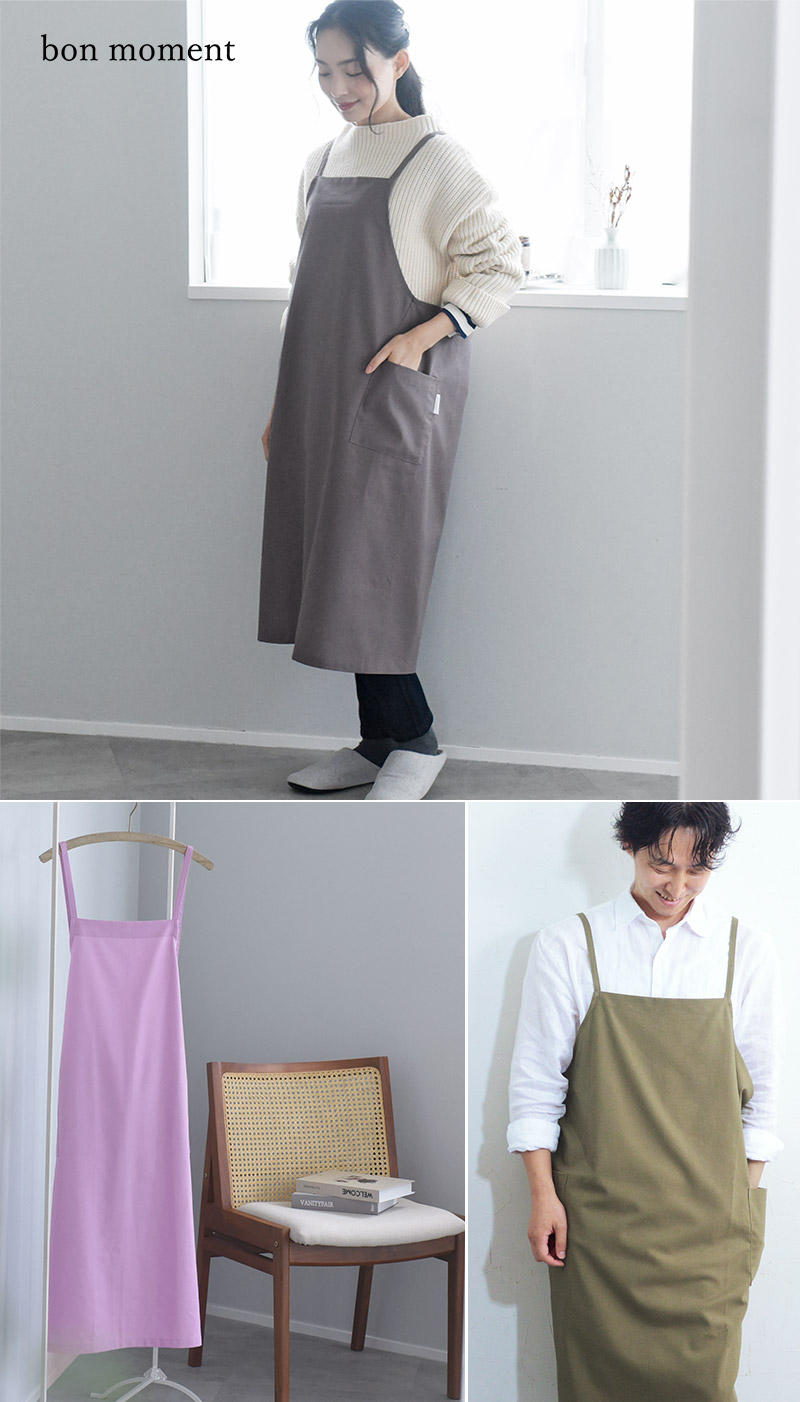 サッと着られて、着用中も首や肩が凝りにくいシンプルエプロン。生地用尺が少なく、軽い着用感が魅力です。