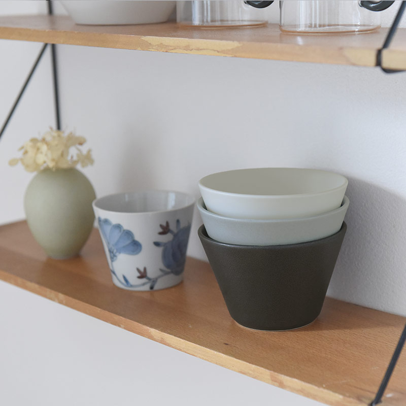 食器棚にすっきり収まるように、スタッキングできる形にしています。同じサイズではもちろん、サイズ違いで重ねて収納することも。