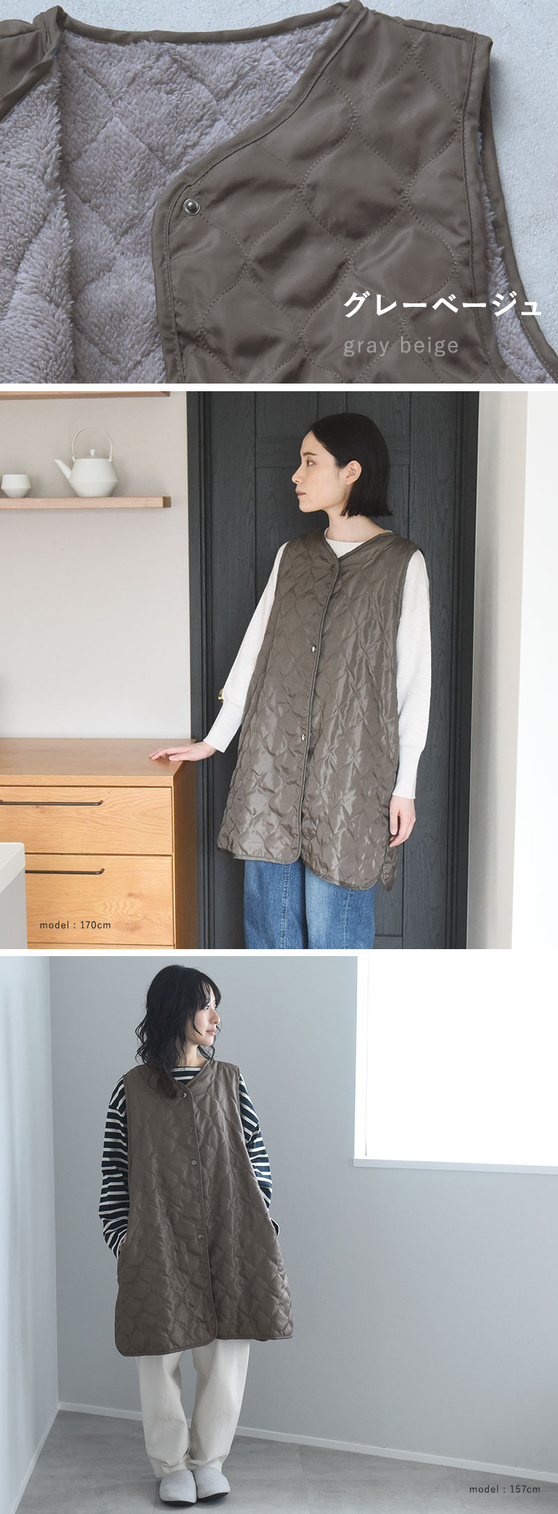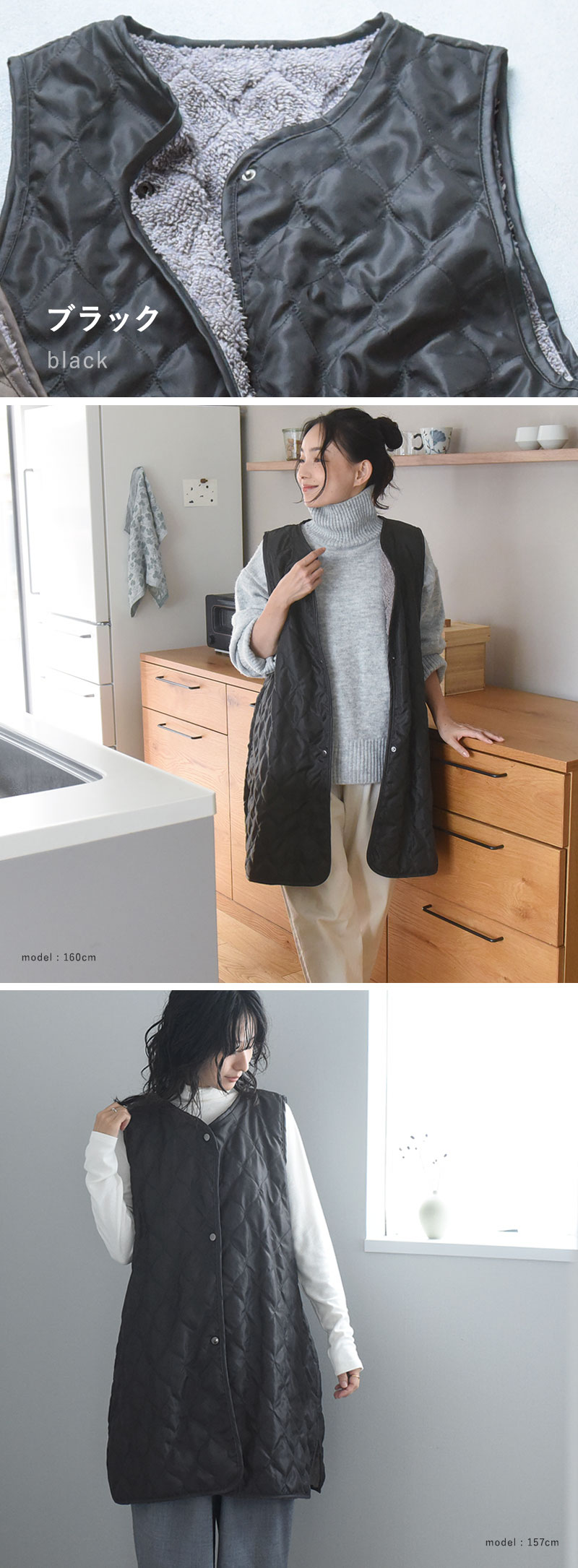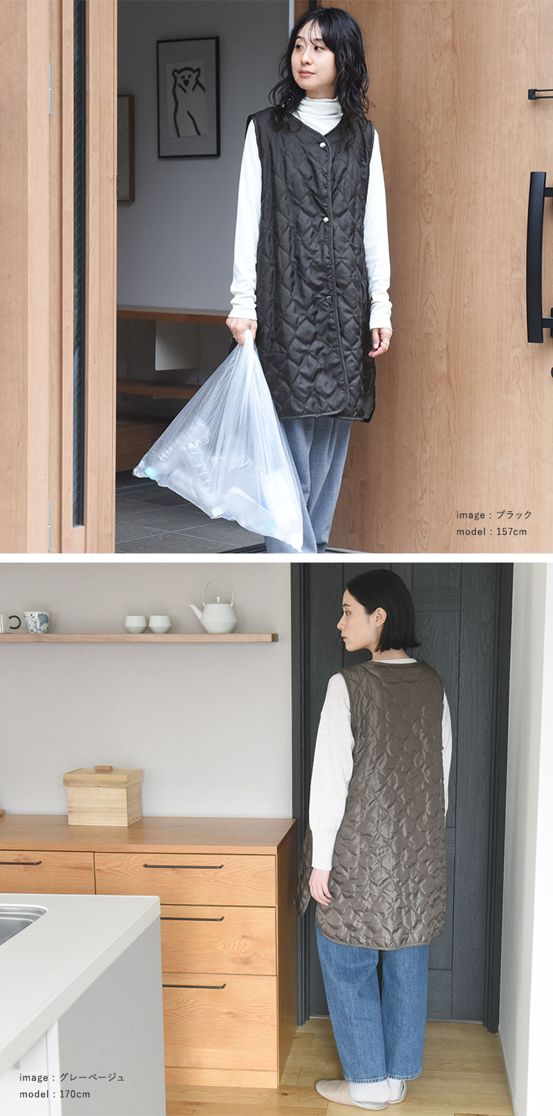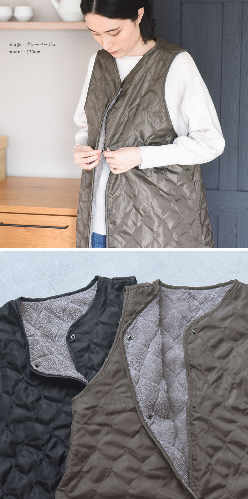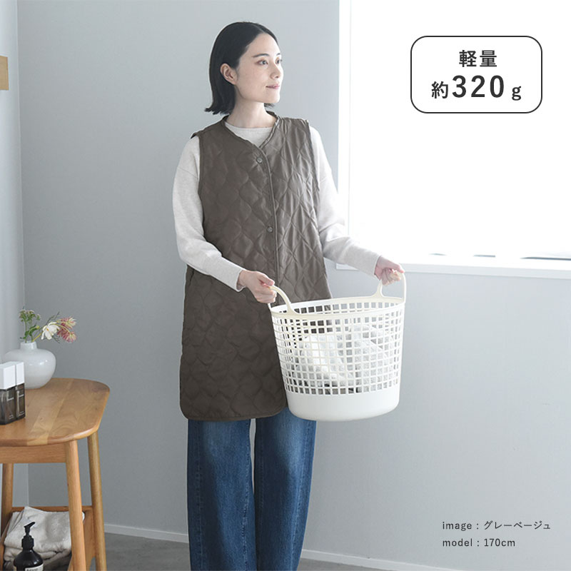 こちらは、重さ約320gで着心地軽やか。軽くてあたたかいので、家事の最中だけでなく、一日中着たまま過ごしていただけます