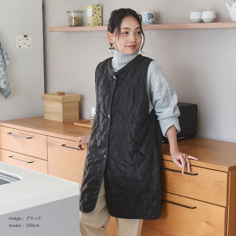 デザインにもこだわって、まるでキルティングアウターのようなお洋服見えエプロンに。着たままゴミ出しもOK、ご近所さんにばったり会っても恥ずかしくありません。