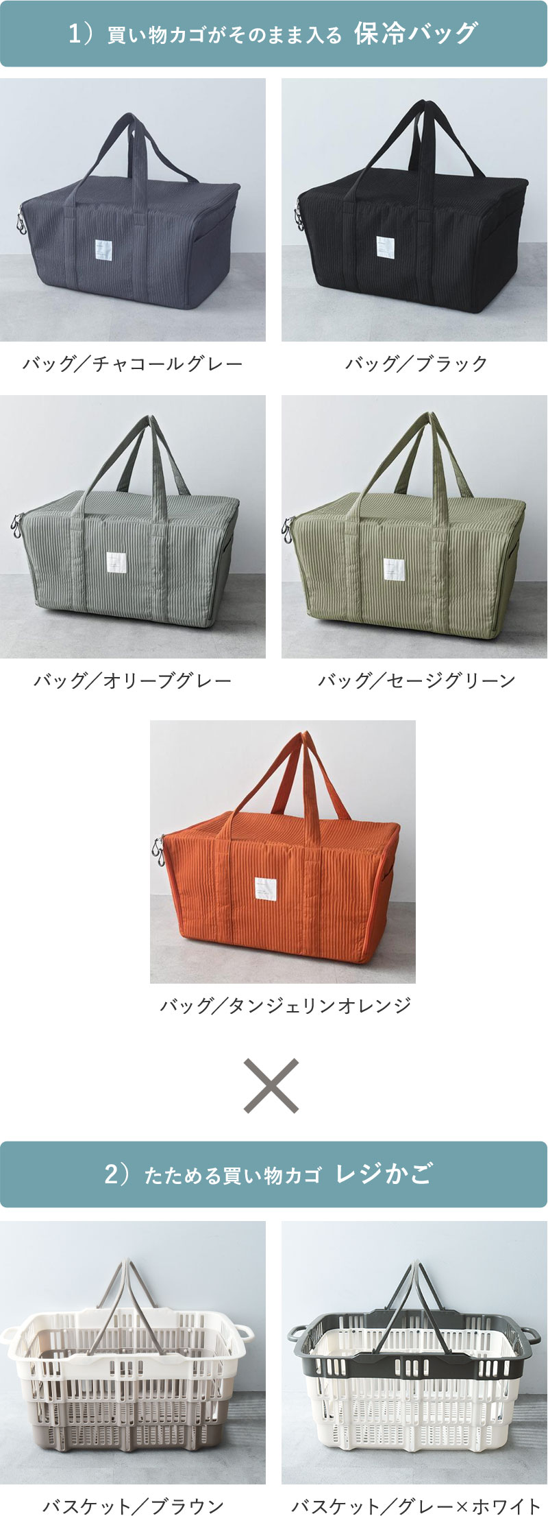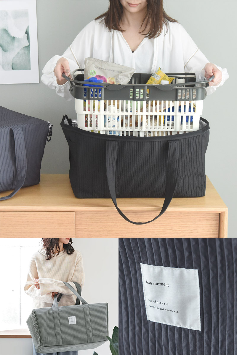 - 車で買い物をするときに便利な折り畳み式のマイカゴと保冷バッグのセット。これがあれば袋の詰め替え必要なし、荷物をそのまま車まで運べてひんやりをキープできます。
