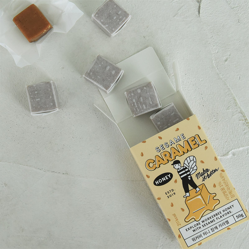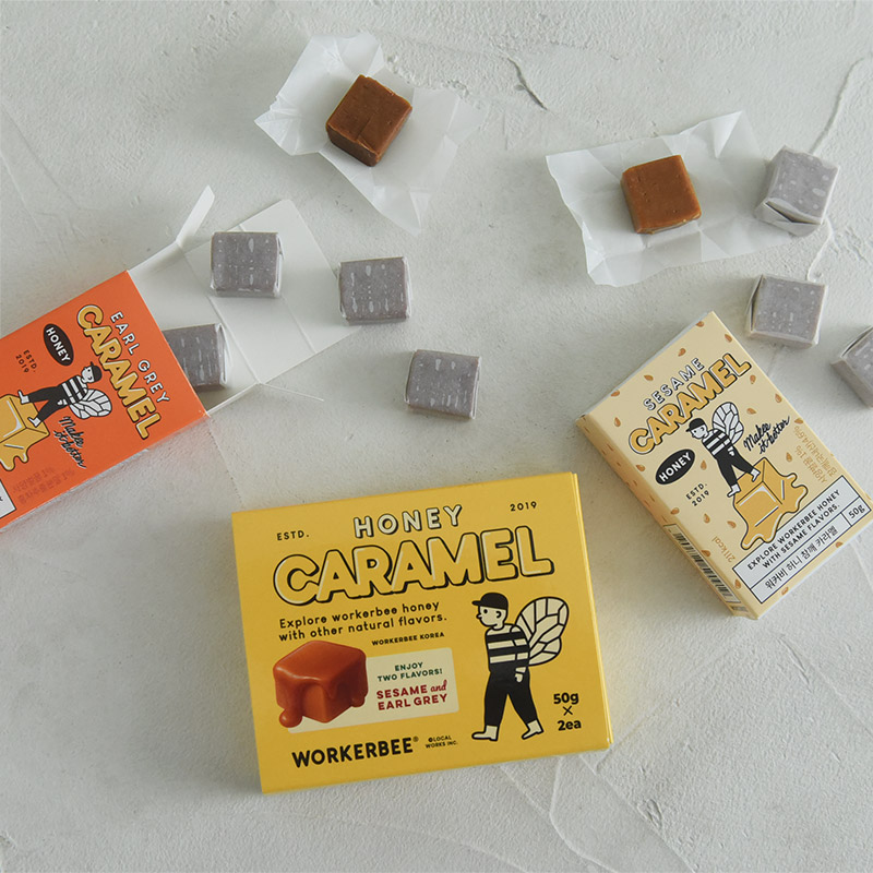 韓国生まれのハチミツ専門ブランド「WORKERBEE(ワーカビー)」のキャラメルボックスは、バッグに忍ばせておくプチおやつに◎。お仕事中にデスクに置いておいても気分が上がるパッケージデザインです。