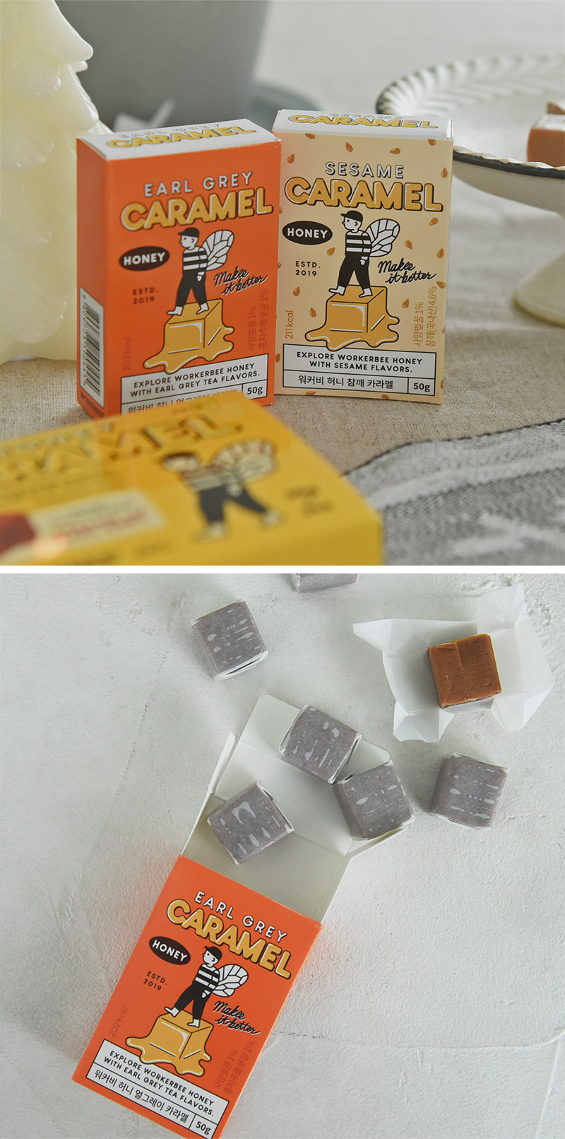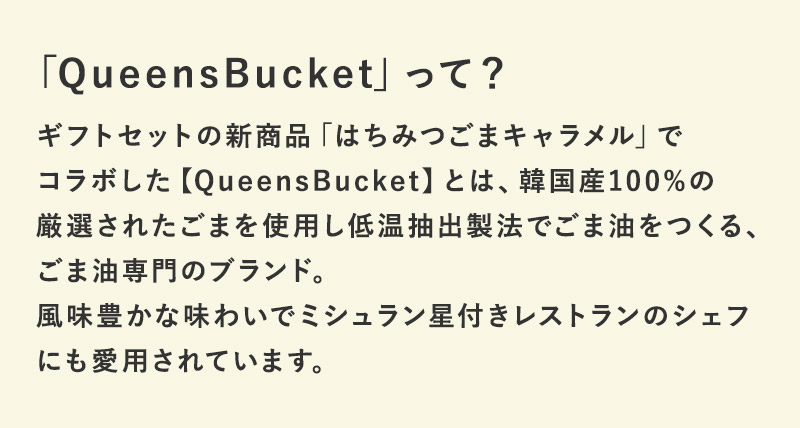 はちみつごまキャラメルはちみつごまキャラメルは、WORKERBEEの新商品。韓国のごま油ブランド「QueensBucket」とコラボレーションで誕生した一品です。韓国産のごまやはちみつを使用し、ごまの香ばしい風味と繊細な甘さ、はちみつの甘みが口いっぱいに広がります。