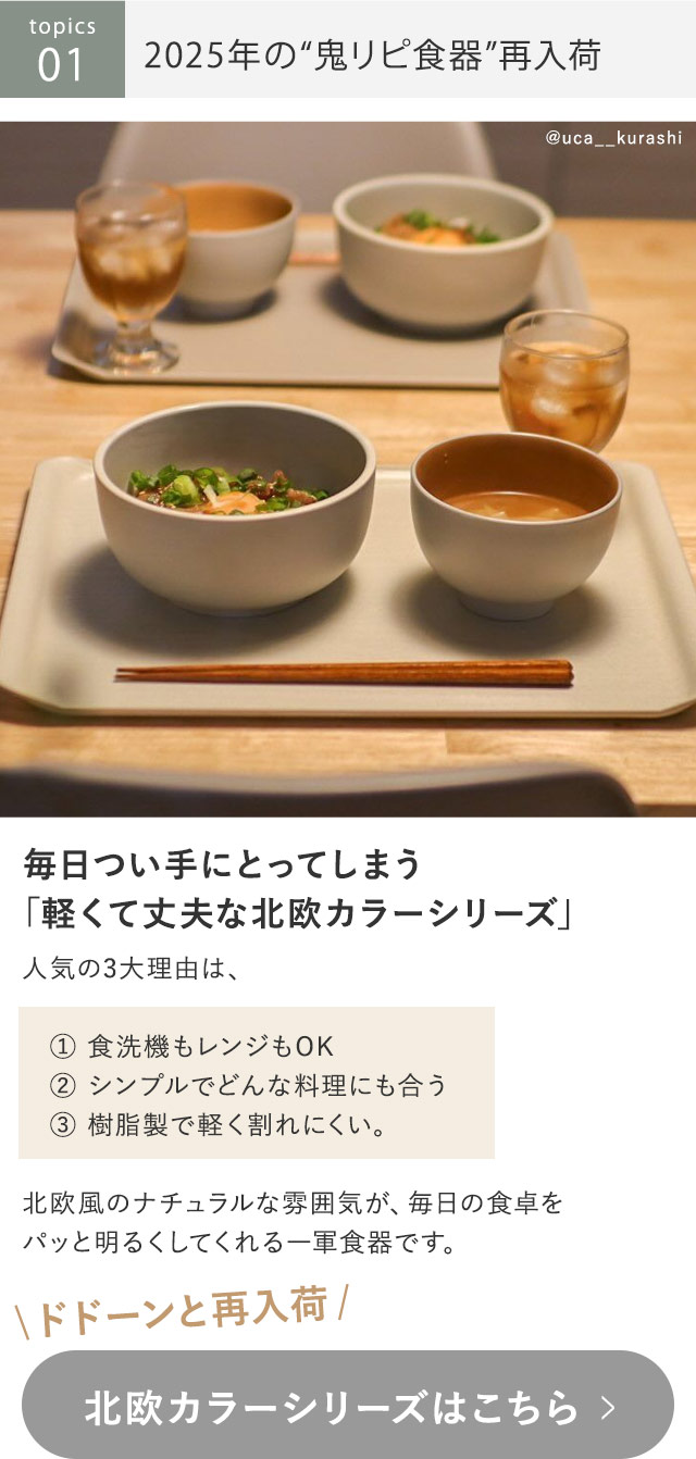 〔1〕 北欧カラーの樹脂食器シリーズ再入荷 〔2〕 新学期に「キッズ水筒」新柄タイプ登場 〔3〕 新年に着たい冬インナー2選 〔4〕 アンジェ2025年の新名品! 〔5〕 リニューアル直前!特別PRICE 7連発