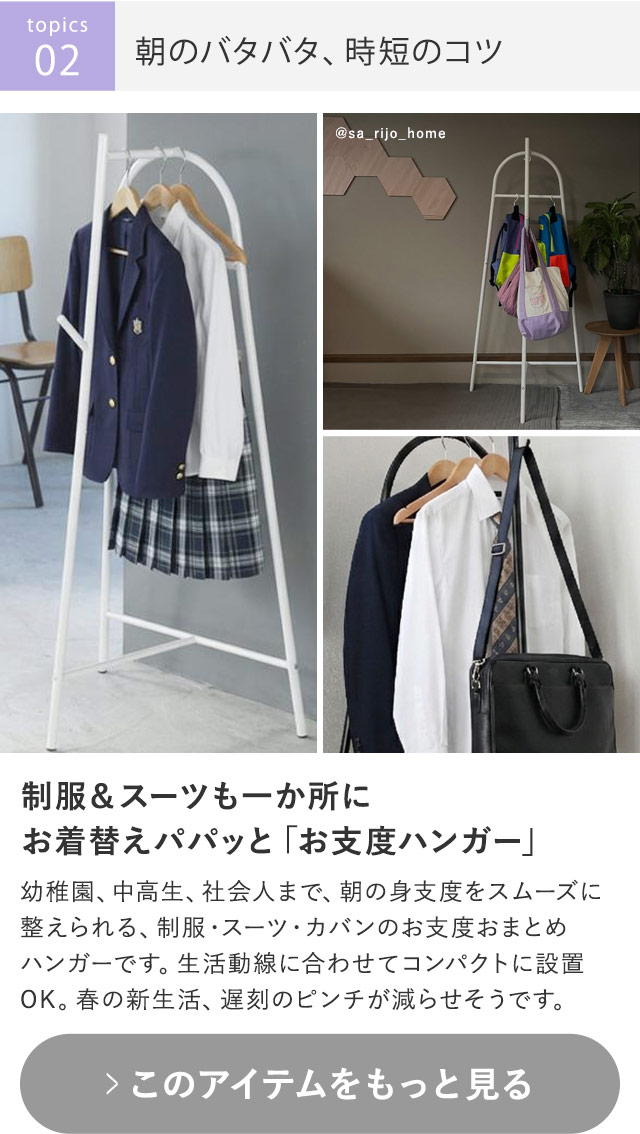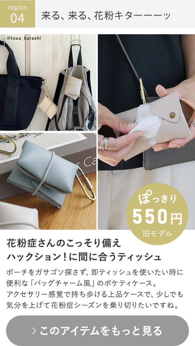 〔1〕 キッズ3WAYボストンに、ガバッと開く新型! 〔2〕 朝の遅刻セーフ、時短「お支度ハンガー」 〔3〕 まるでスイーツ、本物果汁のサッと溶け紅茶 〔4〕 花粉症さんへ、ポケティケースSALE 〔5〕 春に欲しい、軽くてきれいめ新作マウンパ!