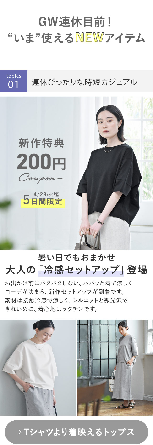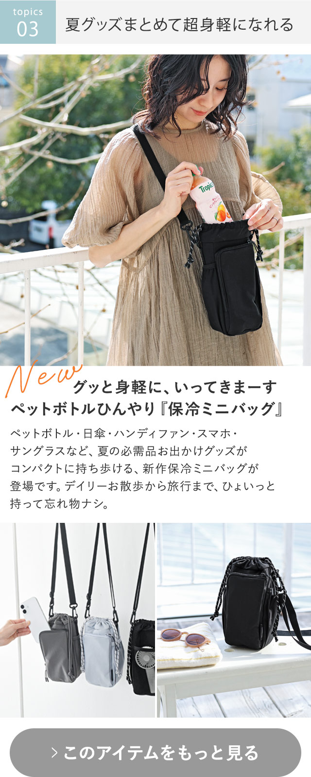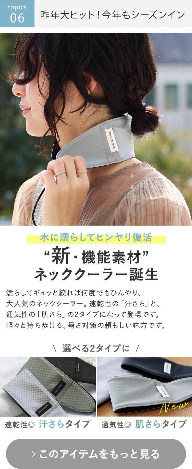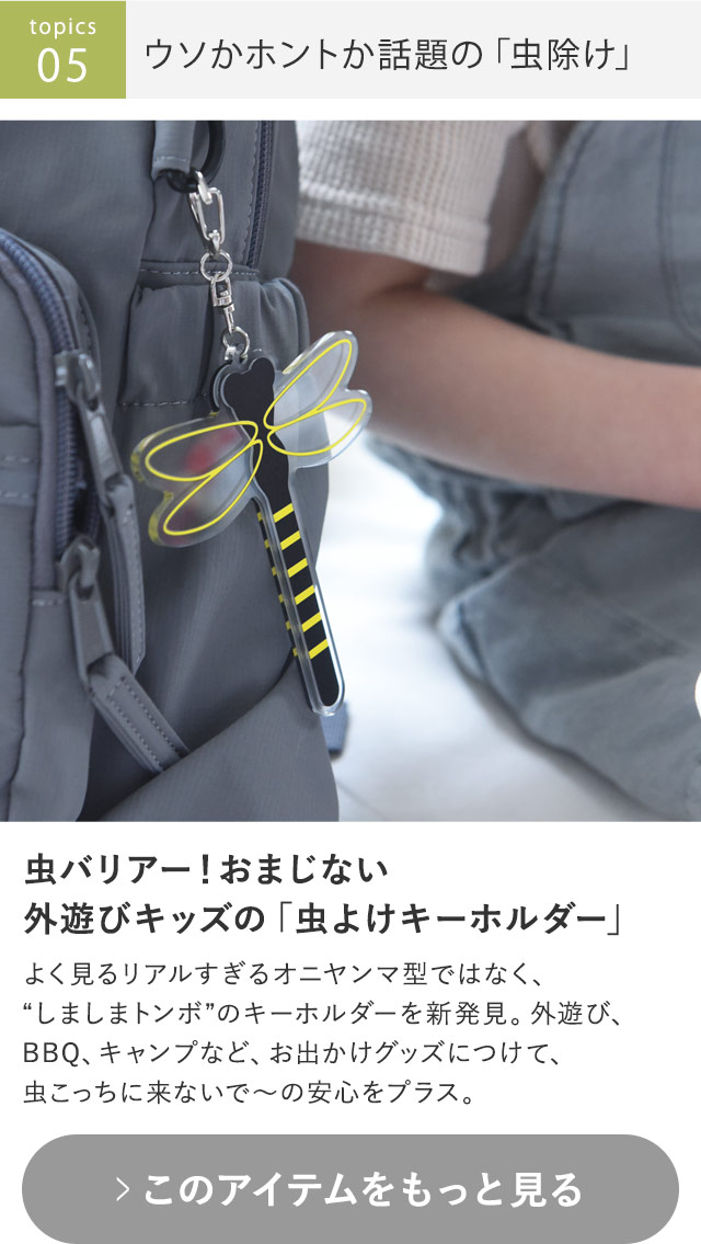 〔1〕 涼しくきれい見え、冷感セットアップ新登場 〔2〕 新アイデア!エコバッグがショルダーに!? 〔3〕 夏グッズまとめて超身軽におでかけ 〔4〕 炎天下ジリジリにNEW対策 〔5〕 しましまトンボで、夏遊びキッズの虫よけ 〔6〕 昨年大ヒット!ネッククーラーに新素材誕生