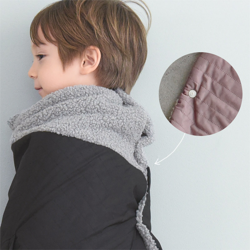 1、スナップボタンでしっかり固定首の後ろ側にあるスナップボタンでしっかり固定。忙しい朝でもサッと装着できるのがポンチョの良いところです。2段階(約4cm)でサイズ調整していただけます。