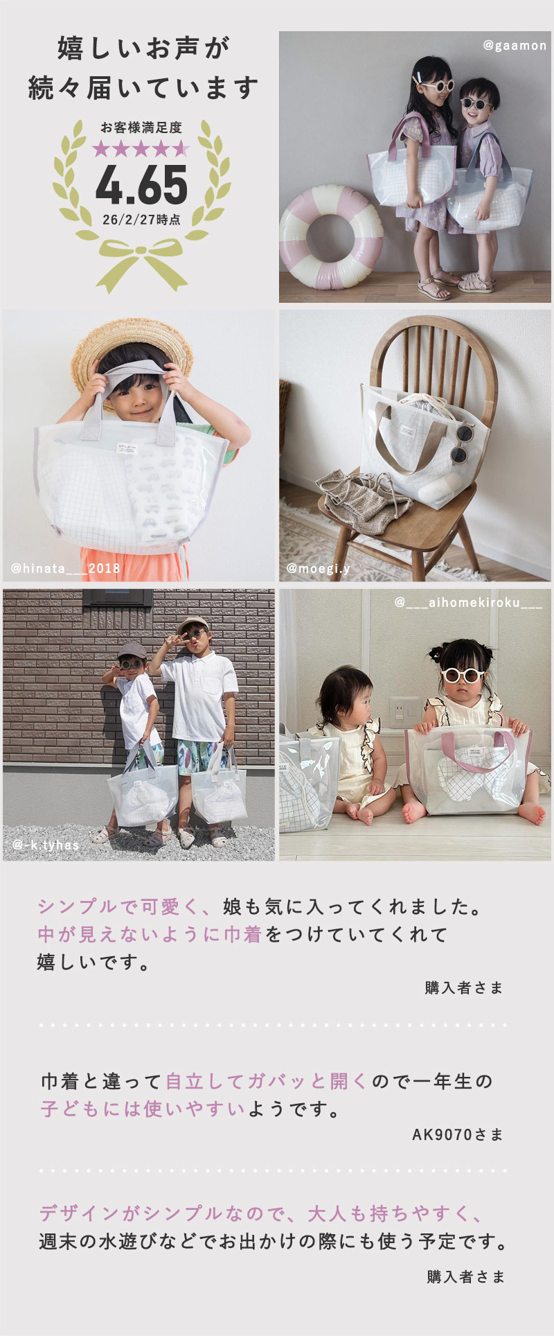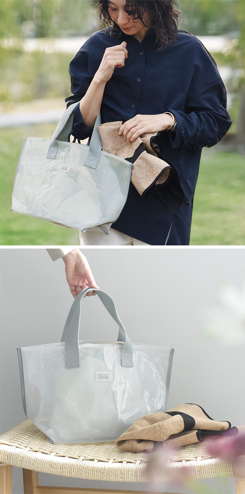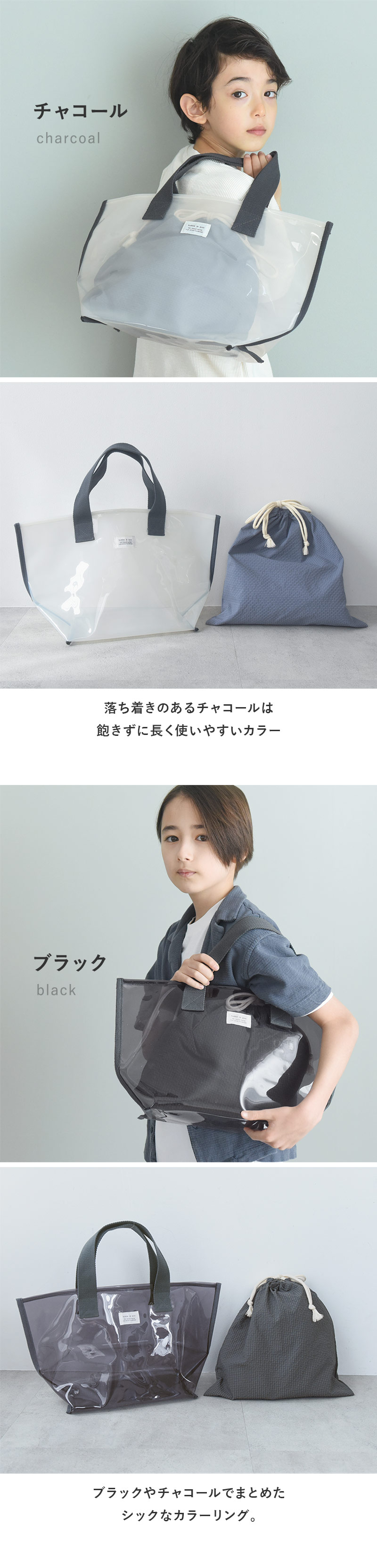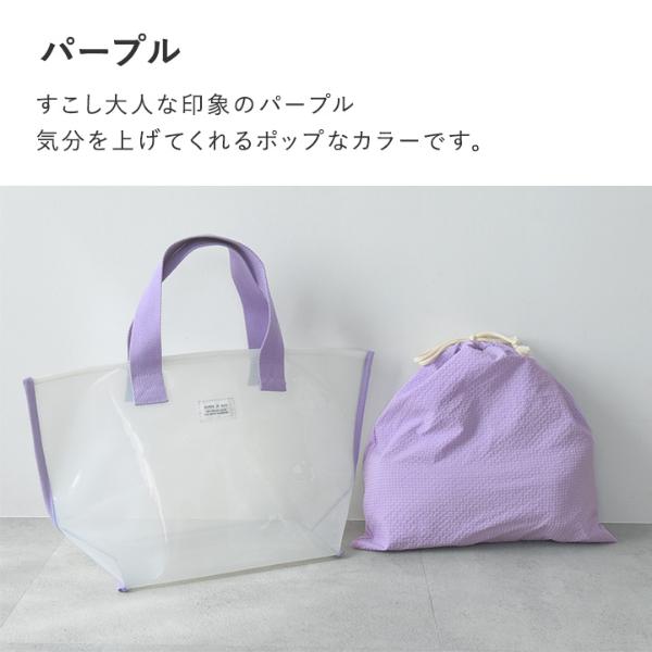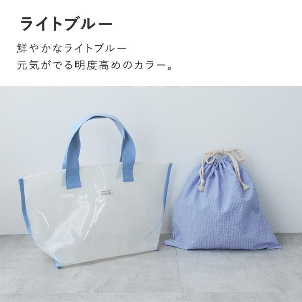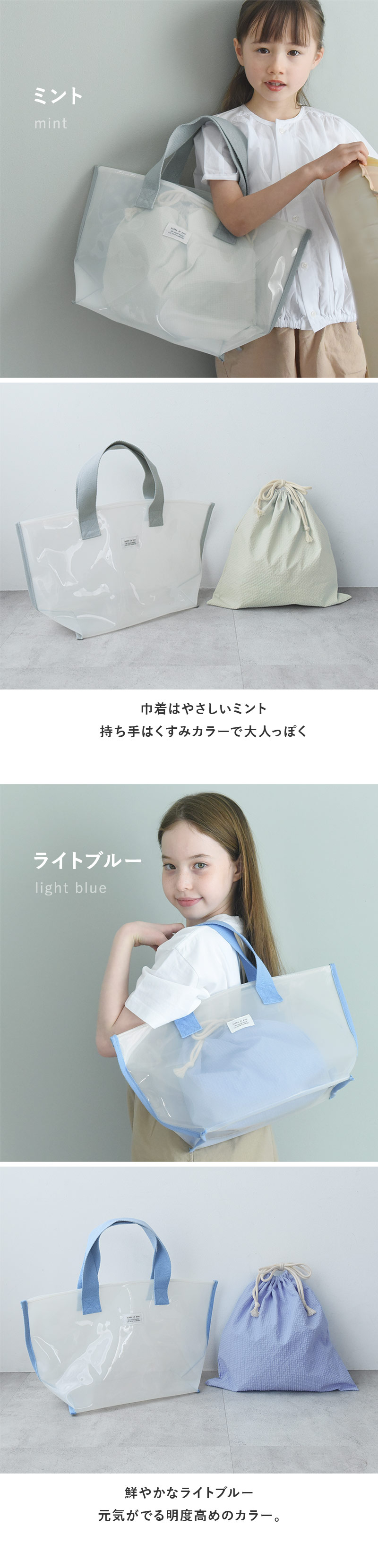 - 涼し気な半透明の子ども用プールバッグ。幅広マチでたっぷり入り、デザインもシンプルな北欧風なので、ママバッグとしても使えます。