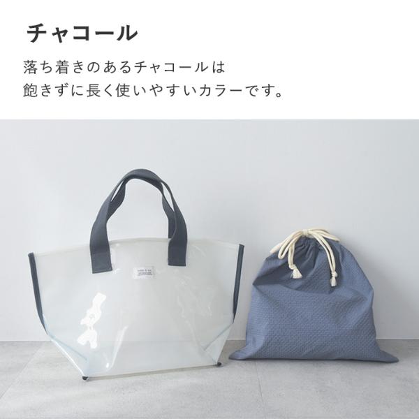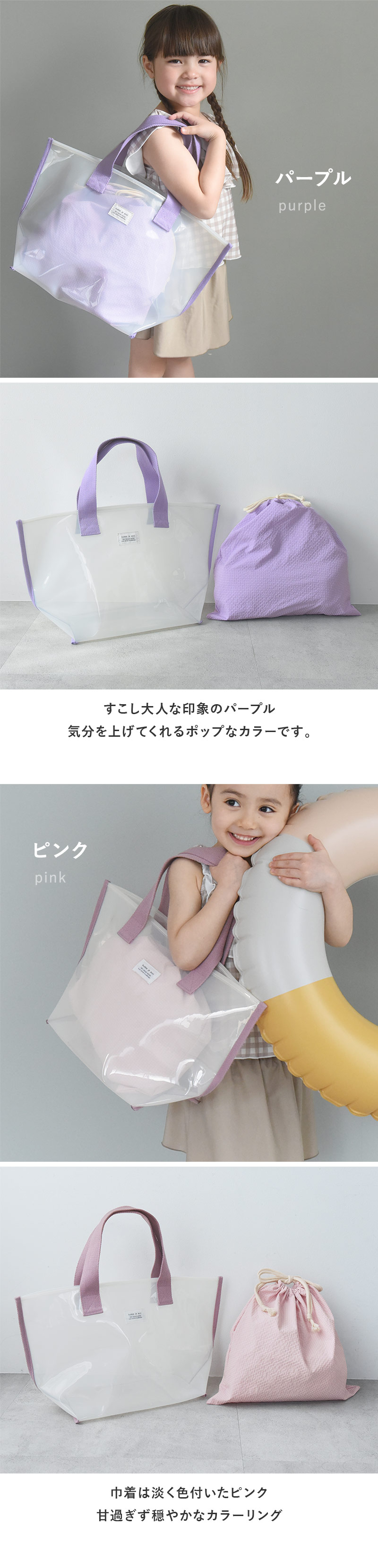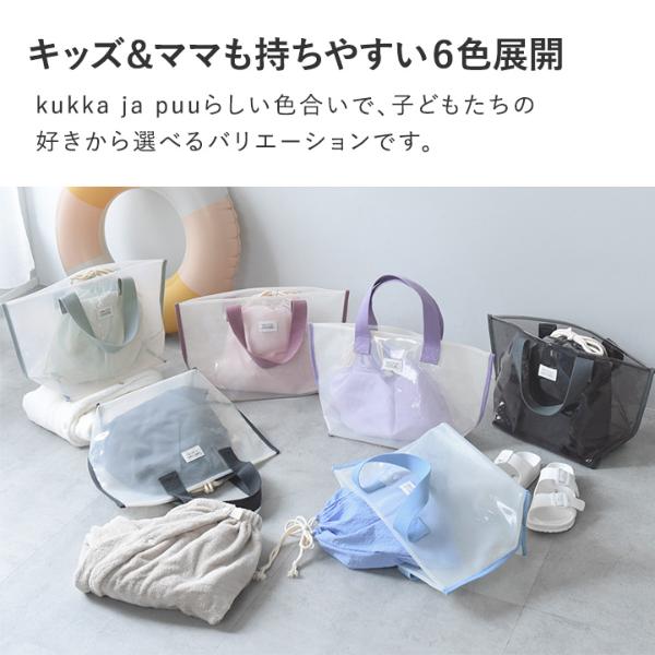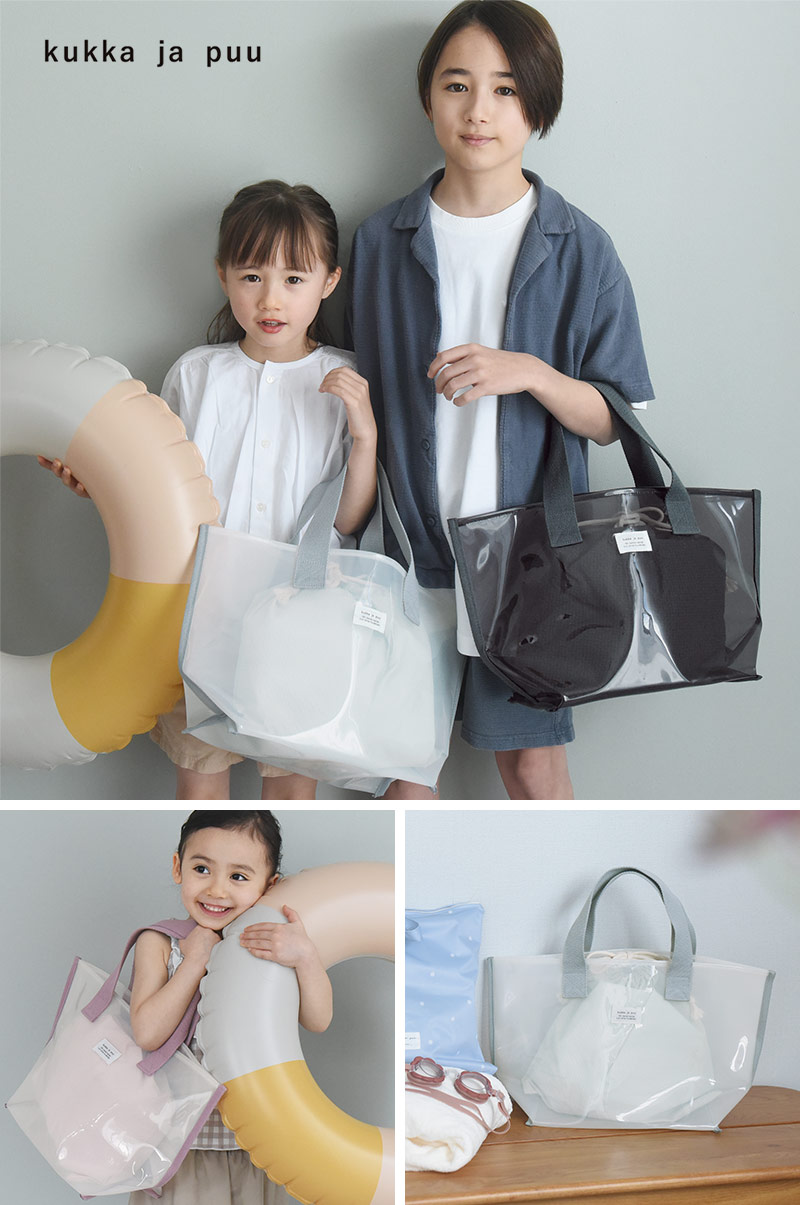 プールデビューの保育園、幼稚園から小学校まで使える、kukka ja puuの広い開口のトート型プールバッグ。透け感ある素材のバッグと、中身を見せない巾着の2点セットです。