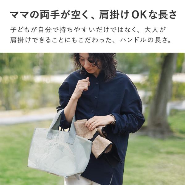 ママの両手が空く、肩掛けOKな長さ子どもが自分で持ちやすいだけではなく、大人が肩掛けできることにもこだわった、ハンドルの長さ。「子どもと一緒の時は両手を空けておきたい」というママの想いに応えます。