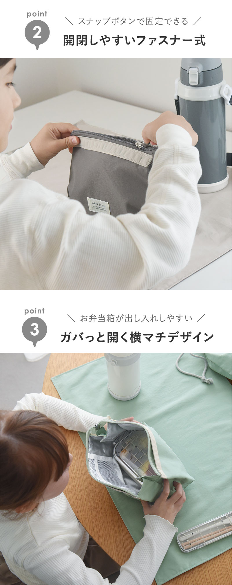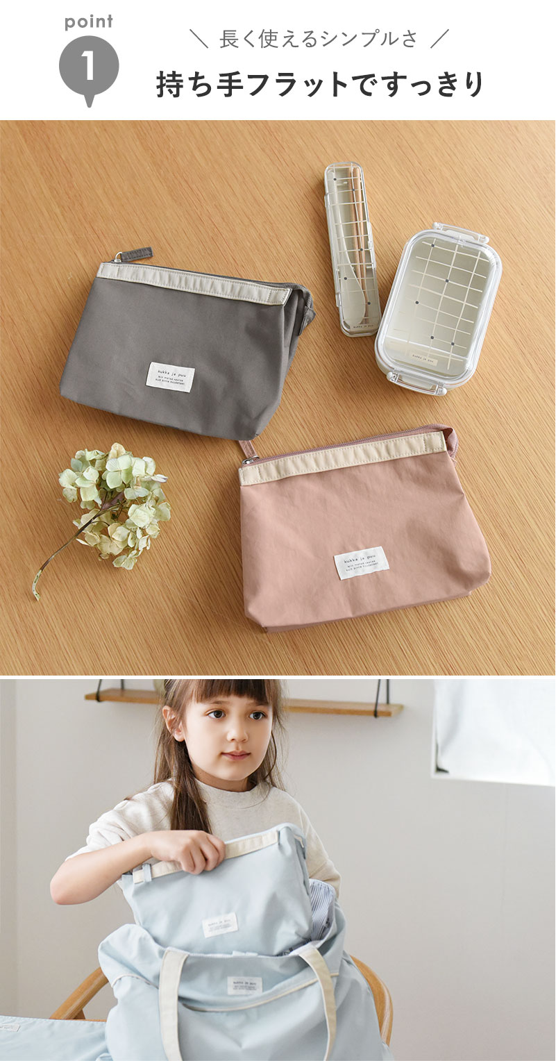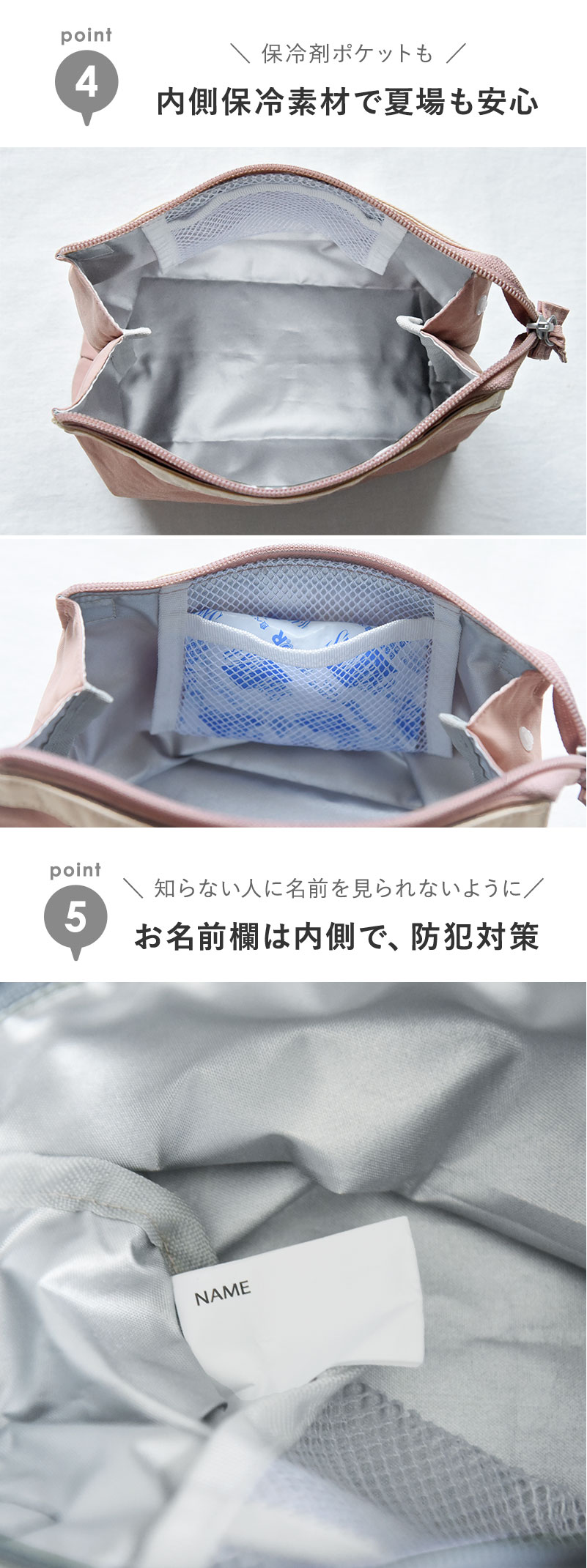 - 通園・通学にもおすすめなキッズランチバッグ。大人かわいいシンプルなカラーリングで、飽きずに長く使えるのがポイント。内側は保冷素材で保冷剤ポケット付きなので夏場も安心。