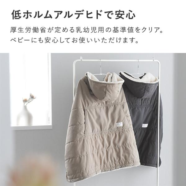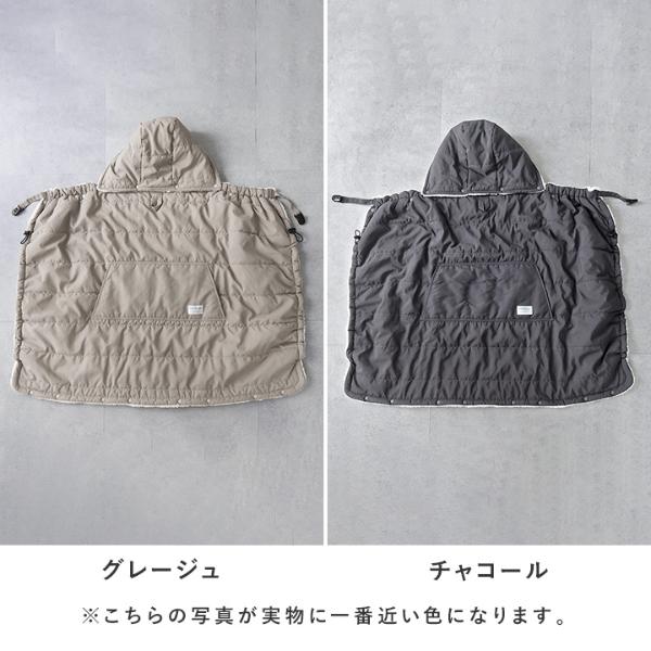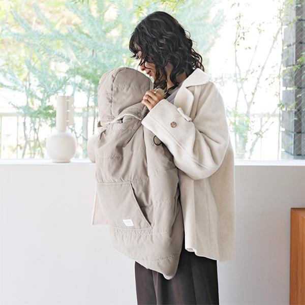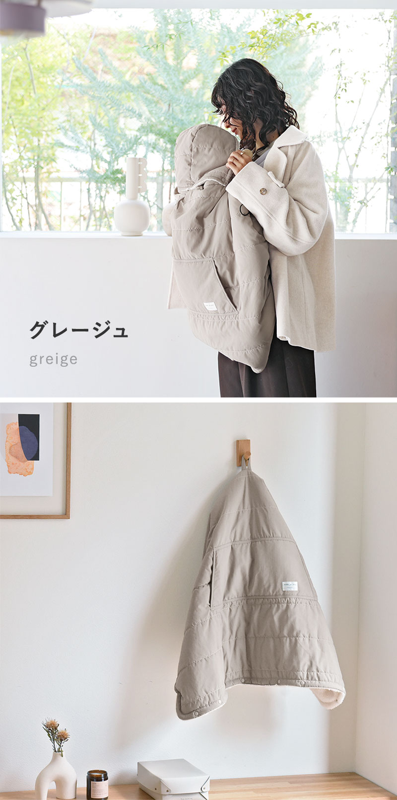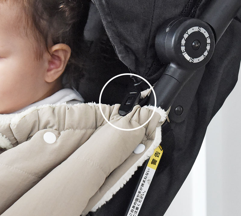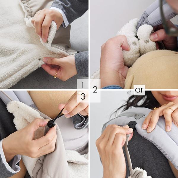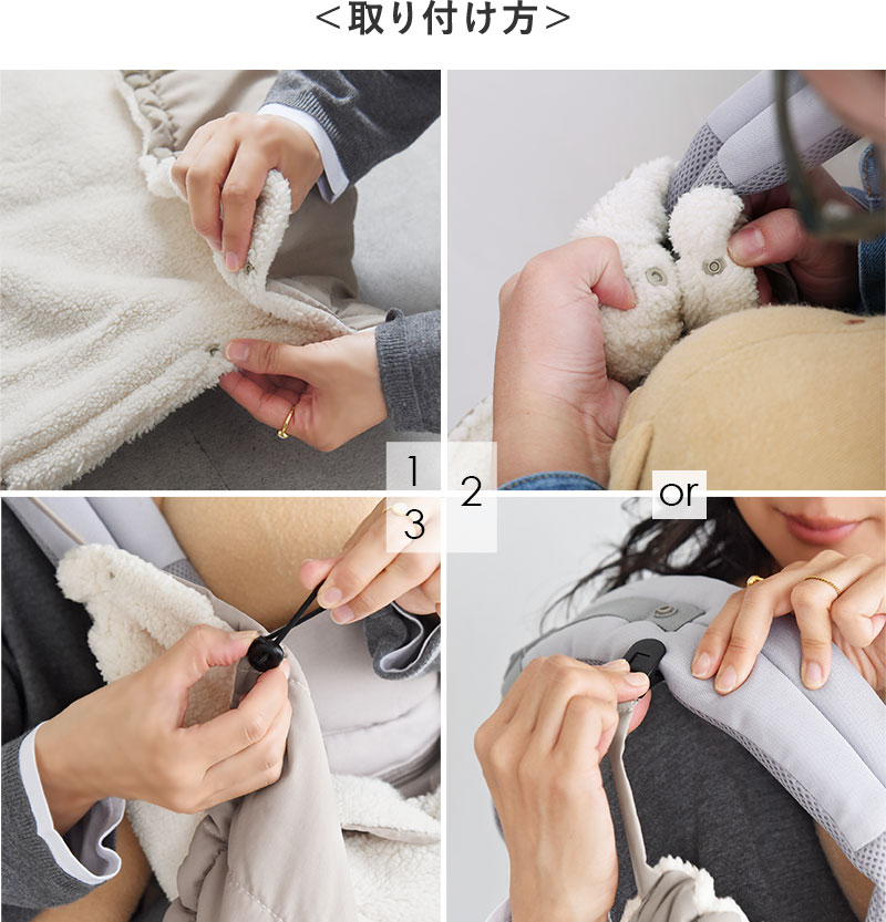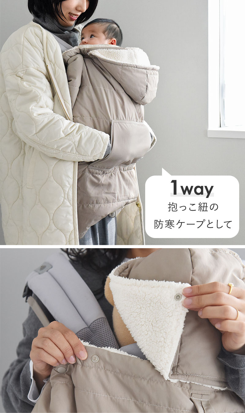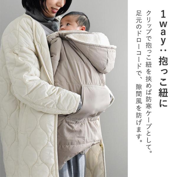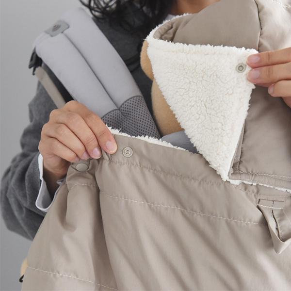 クリップで抱っこ紐を挟めば防寒ケープとして。足元のスナップボタンやドローコードを調節すれば、隙間風を防げます。