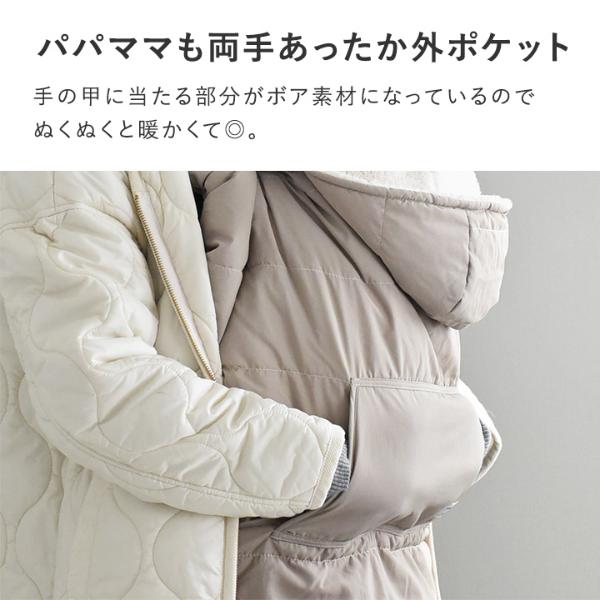外ポケットで両手あったかご使用中に、パパやママの手を温められる外ポケット付き。手の甲に当たる部分がボア素材になっているのでぬくぬくと暖かくて◎。