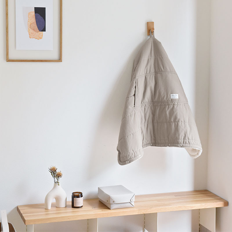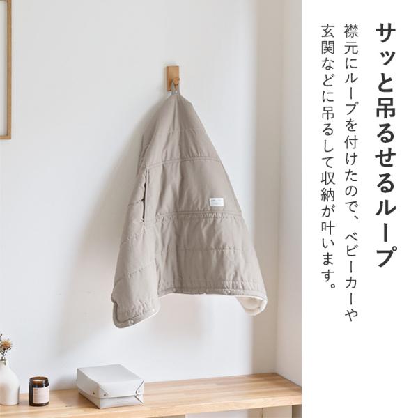 サッと吊るせるループ使用頻度の高いものだから、きれいに畳まずともサッとフックなどに吊るせるのが理想。襟元にループを付けたので、ベビーカーや玄関などに吊るして収納が叶います。