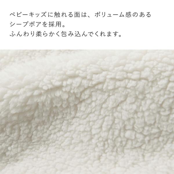 ベビーキッズに触れる面は、ボリューム感のあるシープボアを採用。ふんわり柔らかく包み込んでくれます。さらにキルティング加工を施すことで、ふんわり感と保温性をアップさせました。