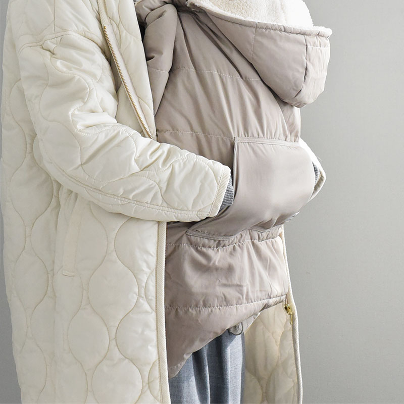 フードは着脱式で、前向き抱っこやベビーカー使いにも安心。内側のふわふわシープボアが、お子さんをしっかりと温めてくれます。