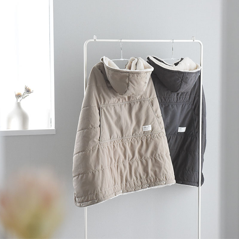 フードとスナップボタンを外し、ドローコードを伸ばしてフラットな状態にすれば、約70×90cmのひざ掛けとして活躍。
