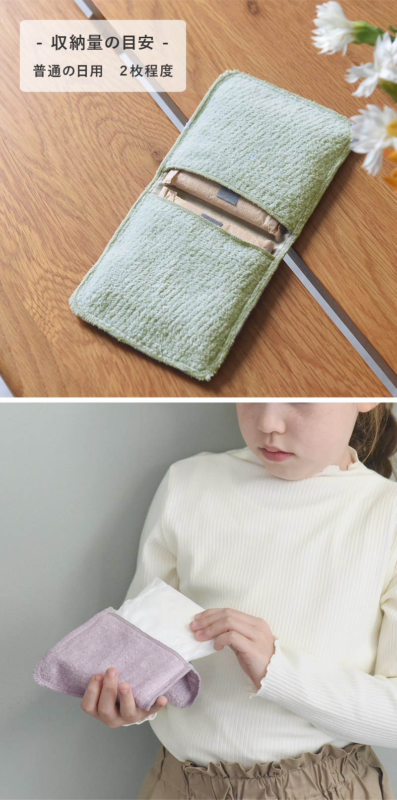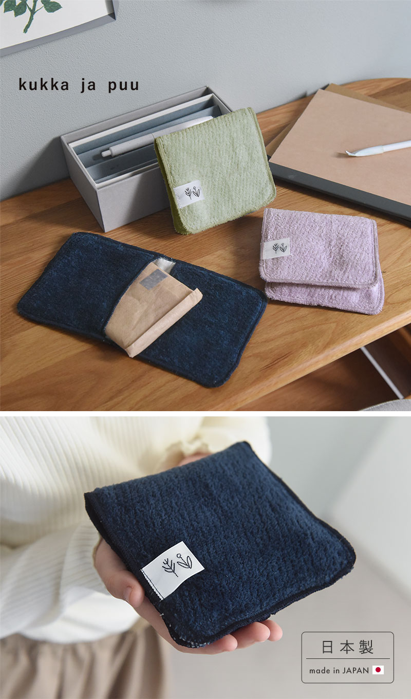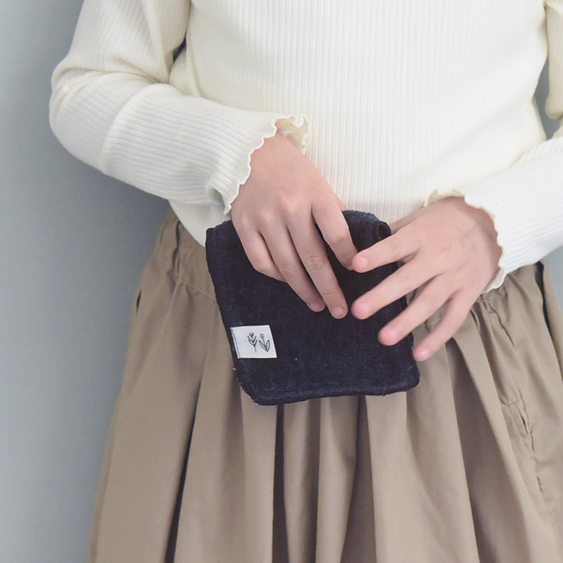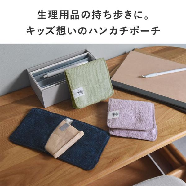 - 日常使いできるタオルハンカチでありながら、ナプキンを入れられてサニタリーポーチとしての役割も。学校生活や宿泊行事などで活躍するコンパクトサイズのハンカチポーチです。