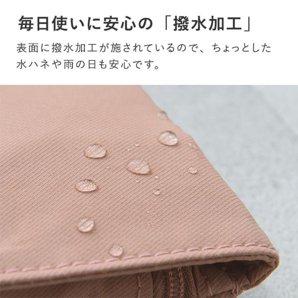 適度な艶感と風合いの良いコットン・ナイロンの混紡生地。摩擦に強いナイロン混にすることで耐久性を高めました。表面に撥水加工が施されているので、ちょっとした水ハネや雨の日も安心です。
