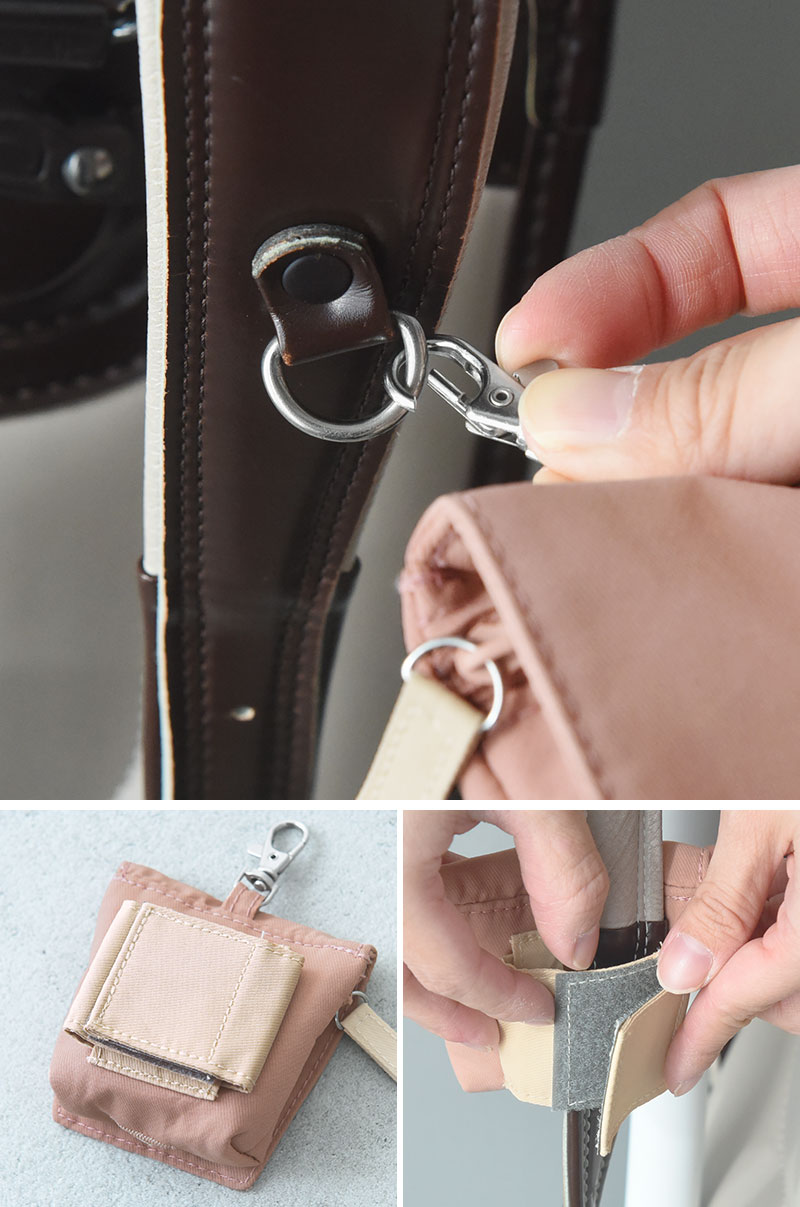 ケース上部のナスカンで、ランドセルのDカンへ取り付け。さらに、面ファスナーをランドセルのショルダーに巻きつければ、しっかりと固定ができます。